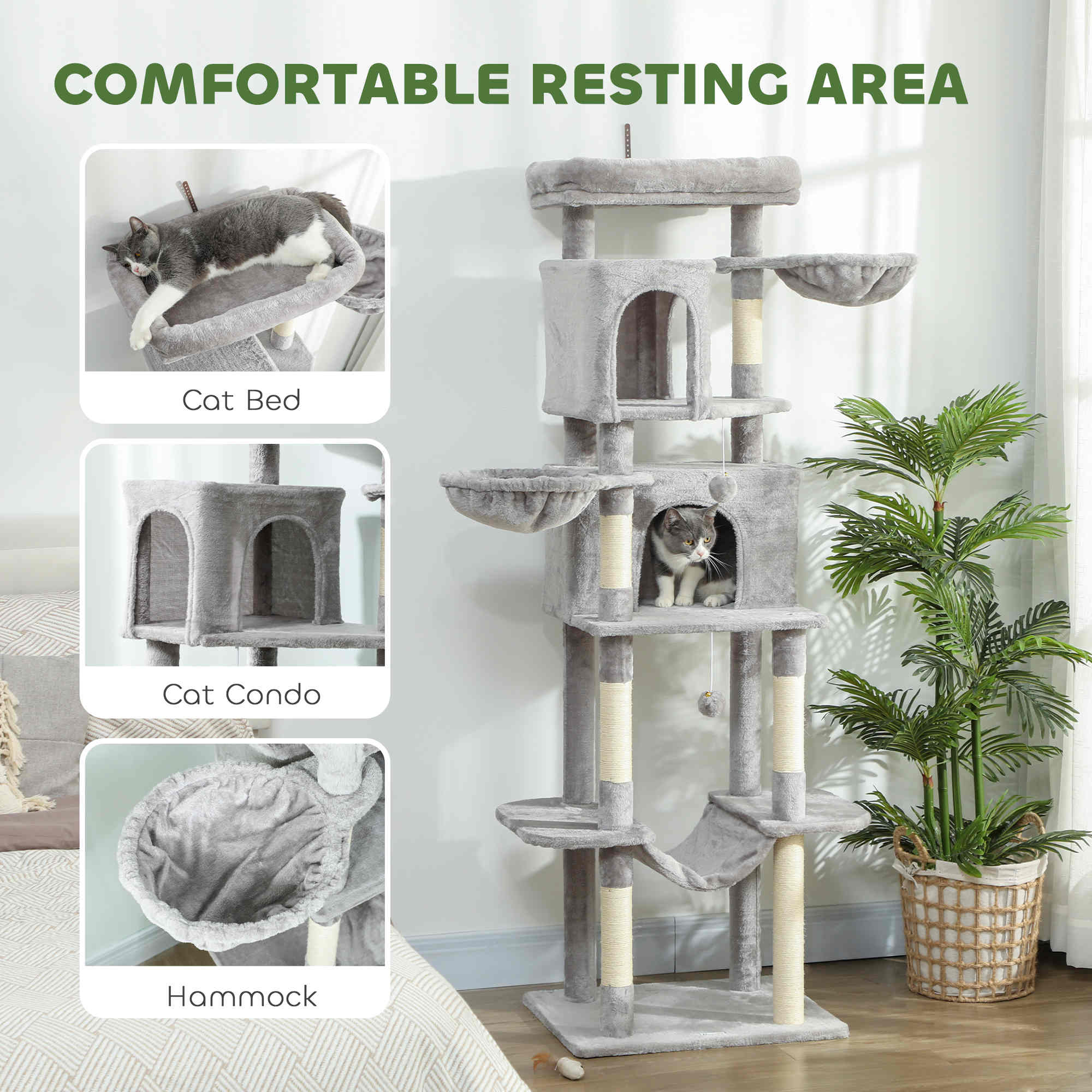 Versatile Use: Specially designed for multi-cat households, this tree offers a multi-level structure with two spacious dens, multiple platforms, and a cozy top perch. The hanging balls and sisal-covered posts stimulate play and hunting instincts, while giving each cat its own space to climb, hide, or rest peacefully.