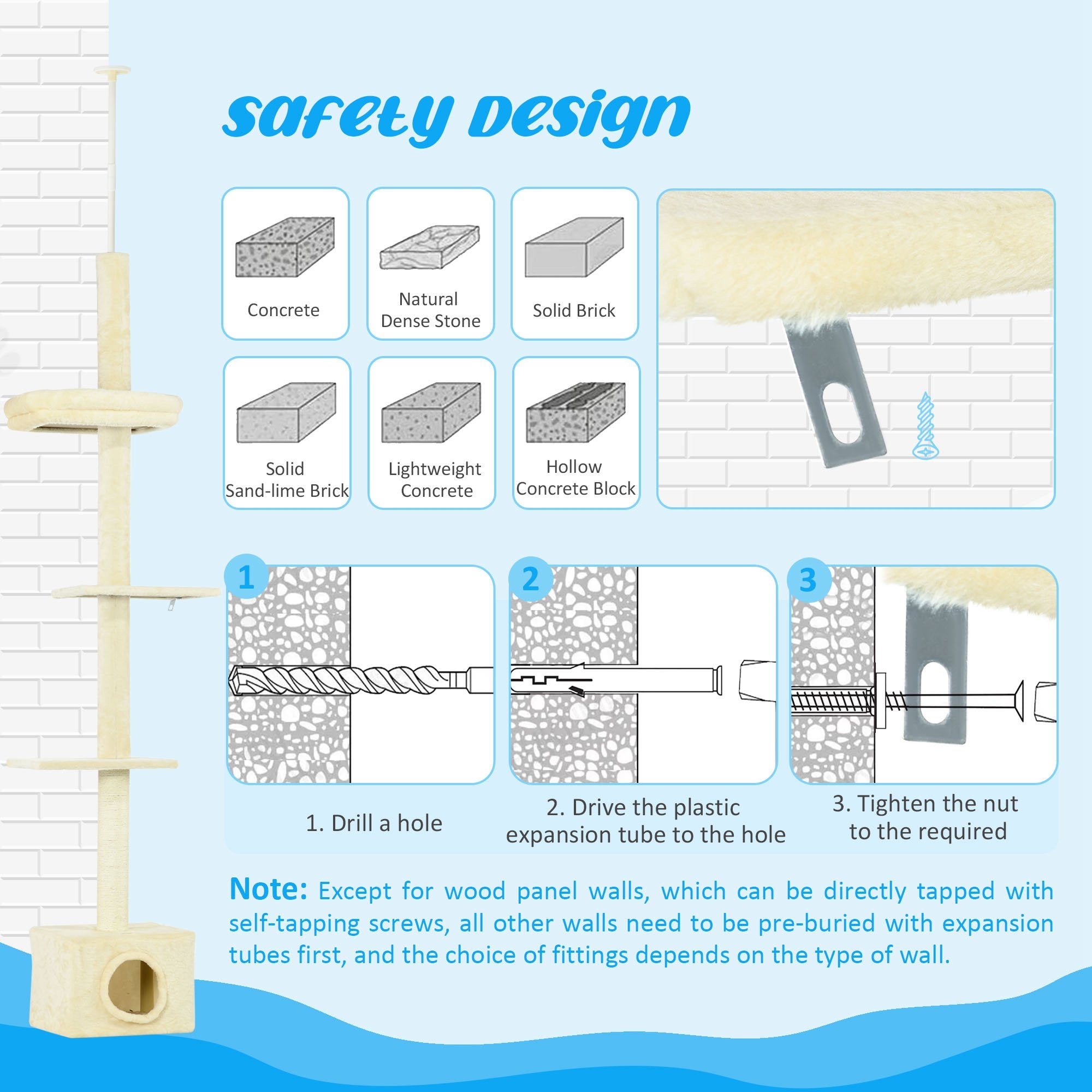 Comfort and design: Give your feline companions a true relaxation space with this elegant beige cat tree. Its tall floor-to-ceiling structure combines modern aesthetics with absolute comfort. Featuring a cozy house, a top bed, and a scratching post, it creates a soothing and luxurious environment for your cats while blending harmoniously into your interior decor.