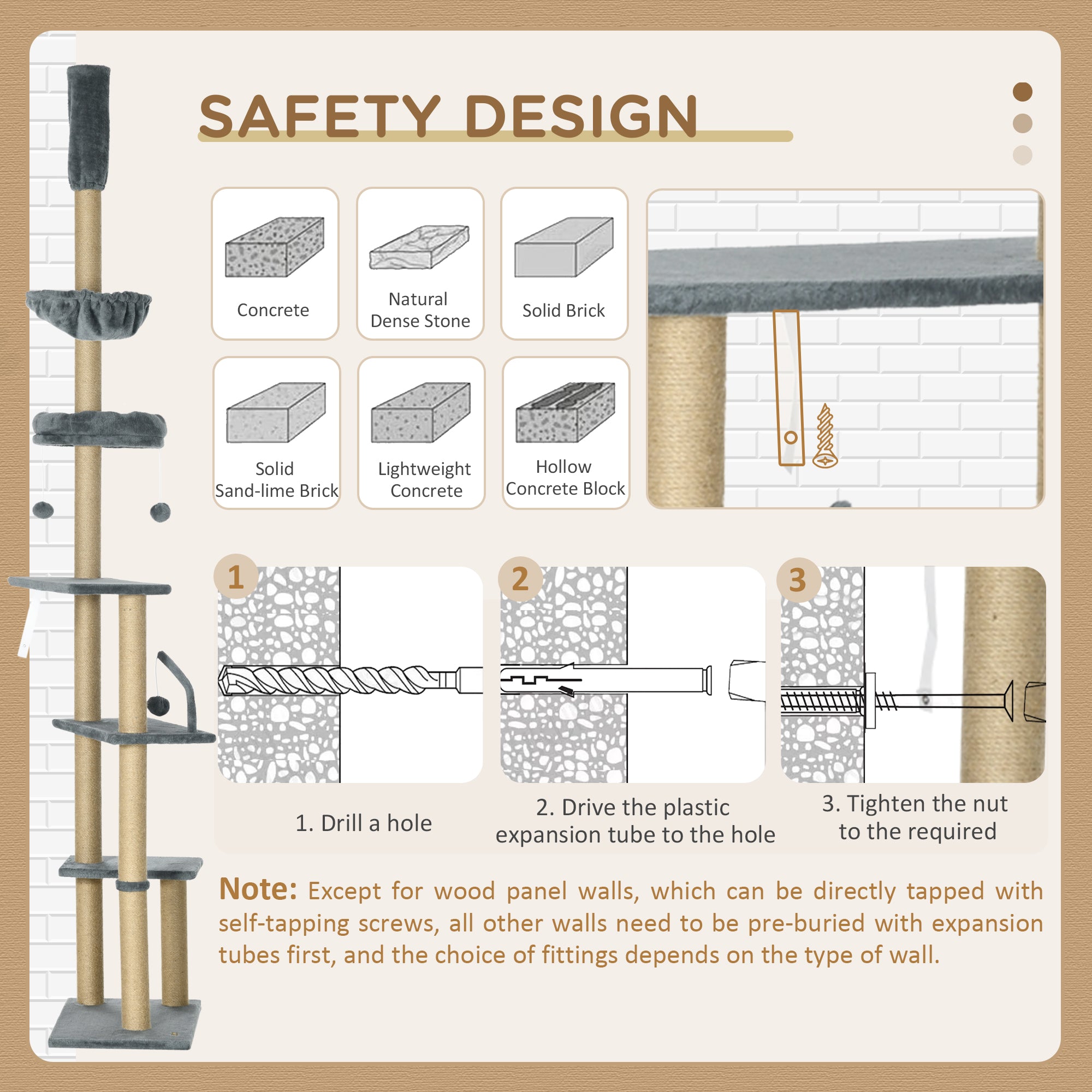 Assembly and Safety: Adjustable height from 230 to 250 cm (90.6" to 98.4") allows the tower to be securely attached to the ceiling with a tension rod. Easy to assemble, it provides a safe and stimulating space for one or two cats weighing less than 5 kg.