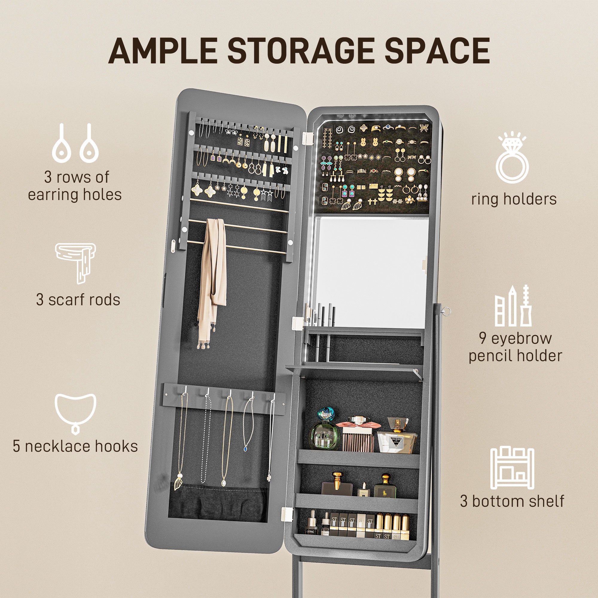 Complete organization: This freestanding jewelry armoire is ideal for storing your necklaces, earrings, rings, watches, and everyday accessories. Its three shelves and thoughtfully designed compartments allow you to keep perfumes, glasses, and beauty products perfectly organized.