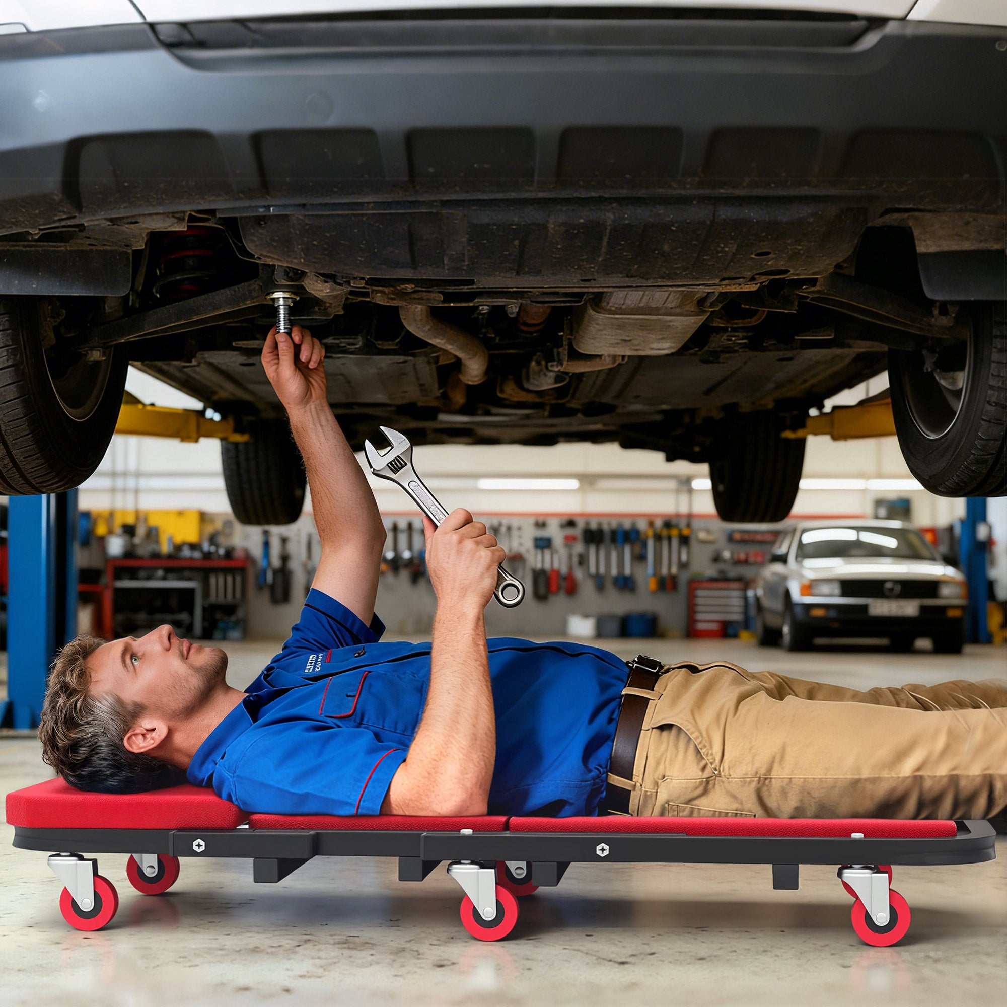 Comfort and design: This versatile mechanical stretcher offers a practical and comfortable solution for automotive work. Its thick padding and easy-to-clean PU cover create a pleasant working surface, whether you are lying under the vehicle or sitting down for tasks at reduced height.