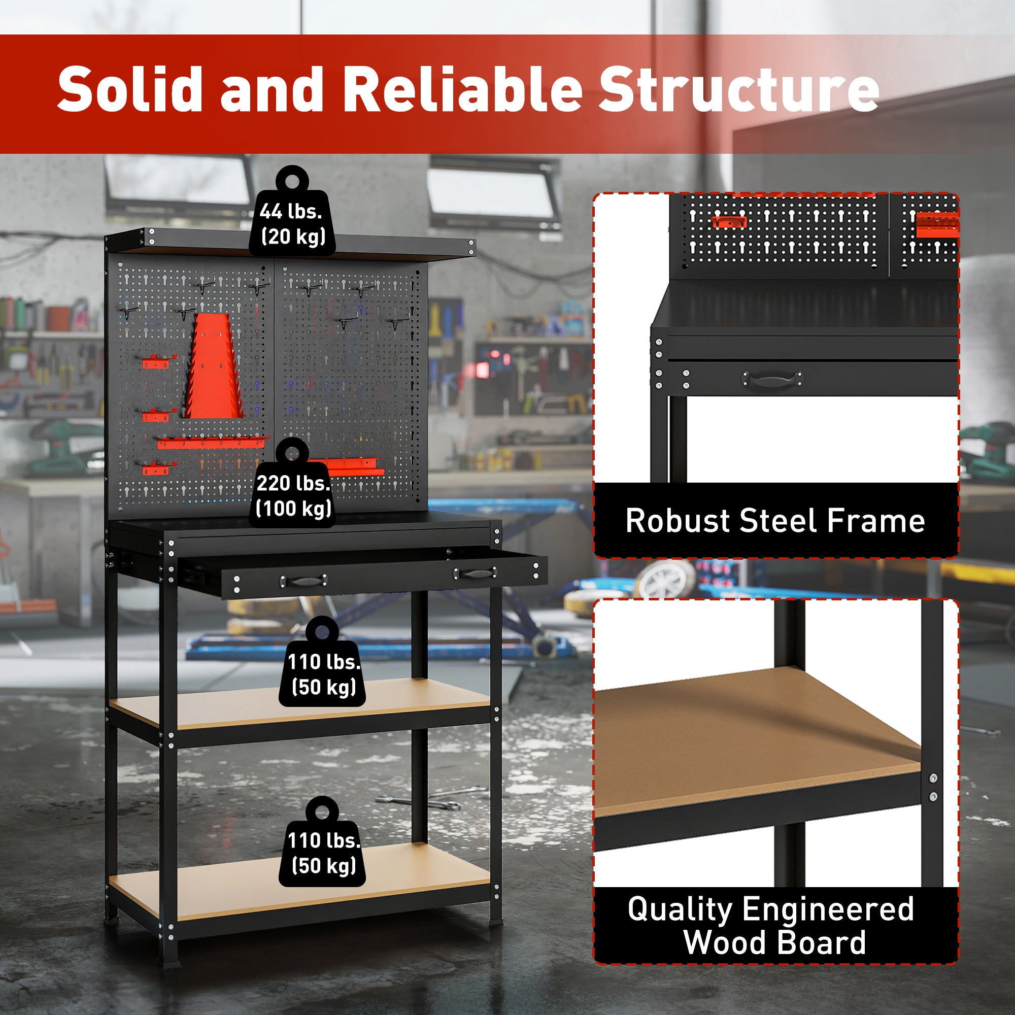 - Capacity: 529 lbs (total), 220 lbs worktop, 110 lbs each shelf, 44 lbs top shelf, 44 lbs pegboard