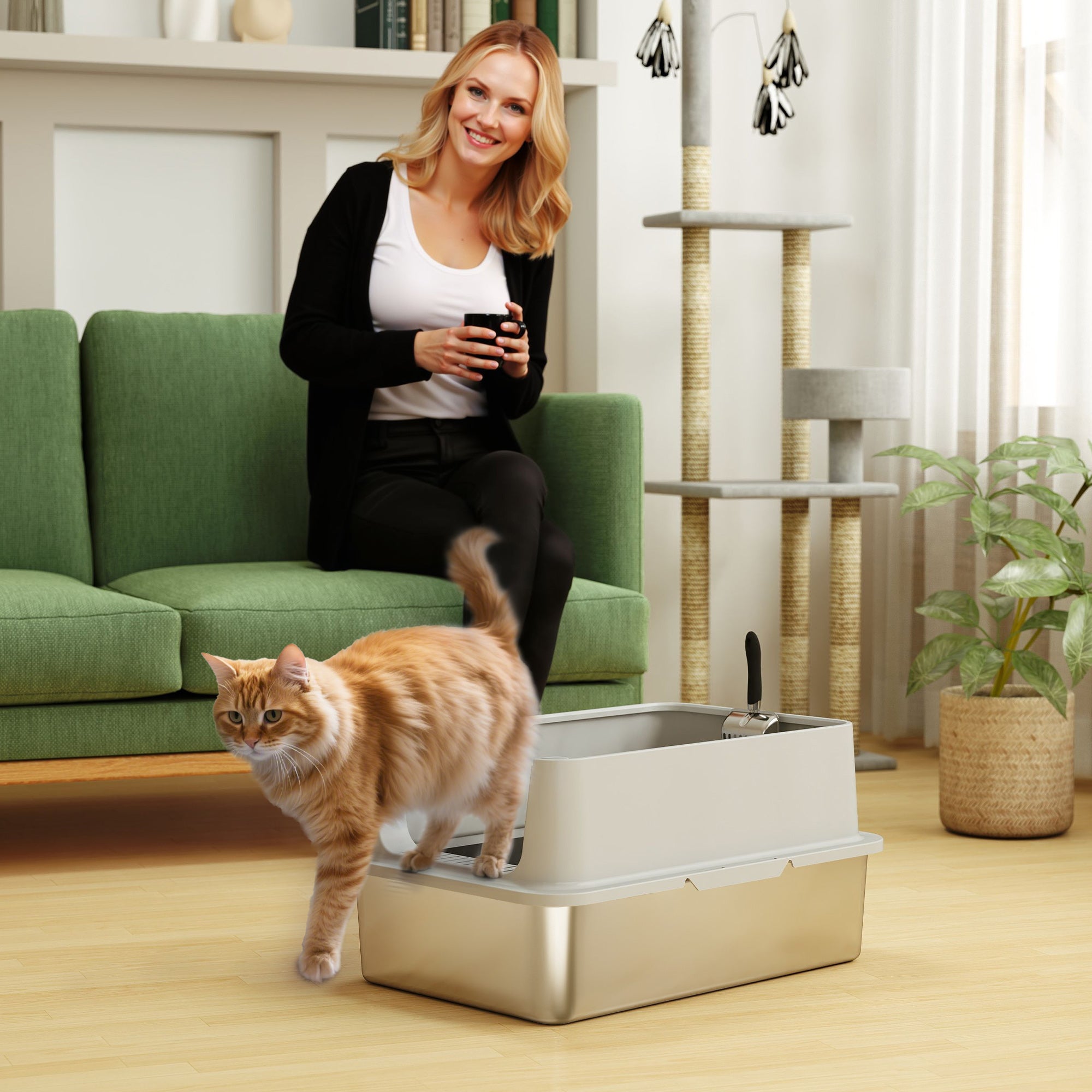 Practical accessories included: A durable stainless steel scoop accompanies the bin to simplify daily cleaning and keep the area clean and tidy.