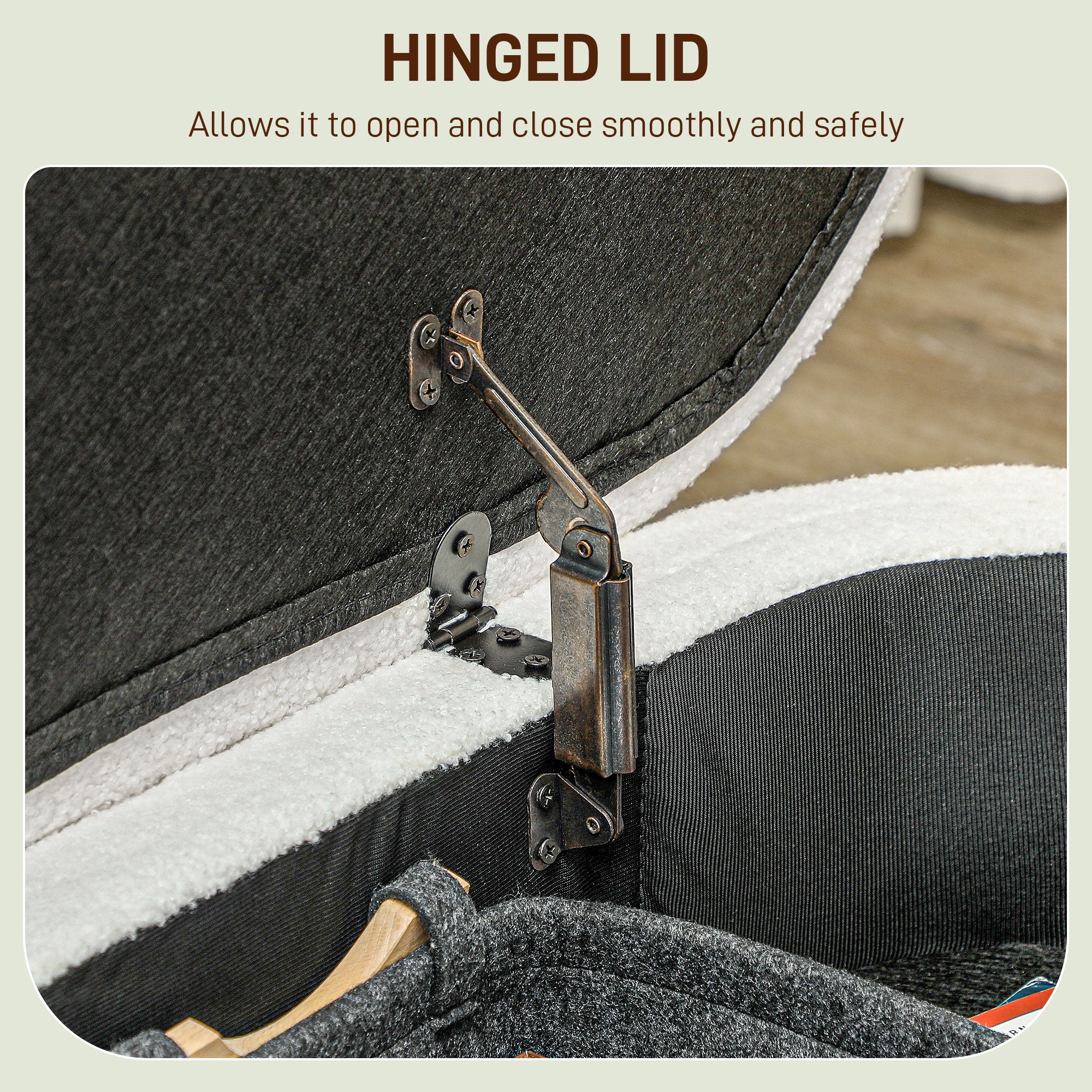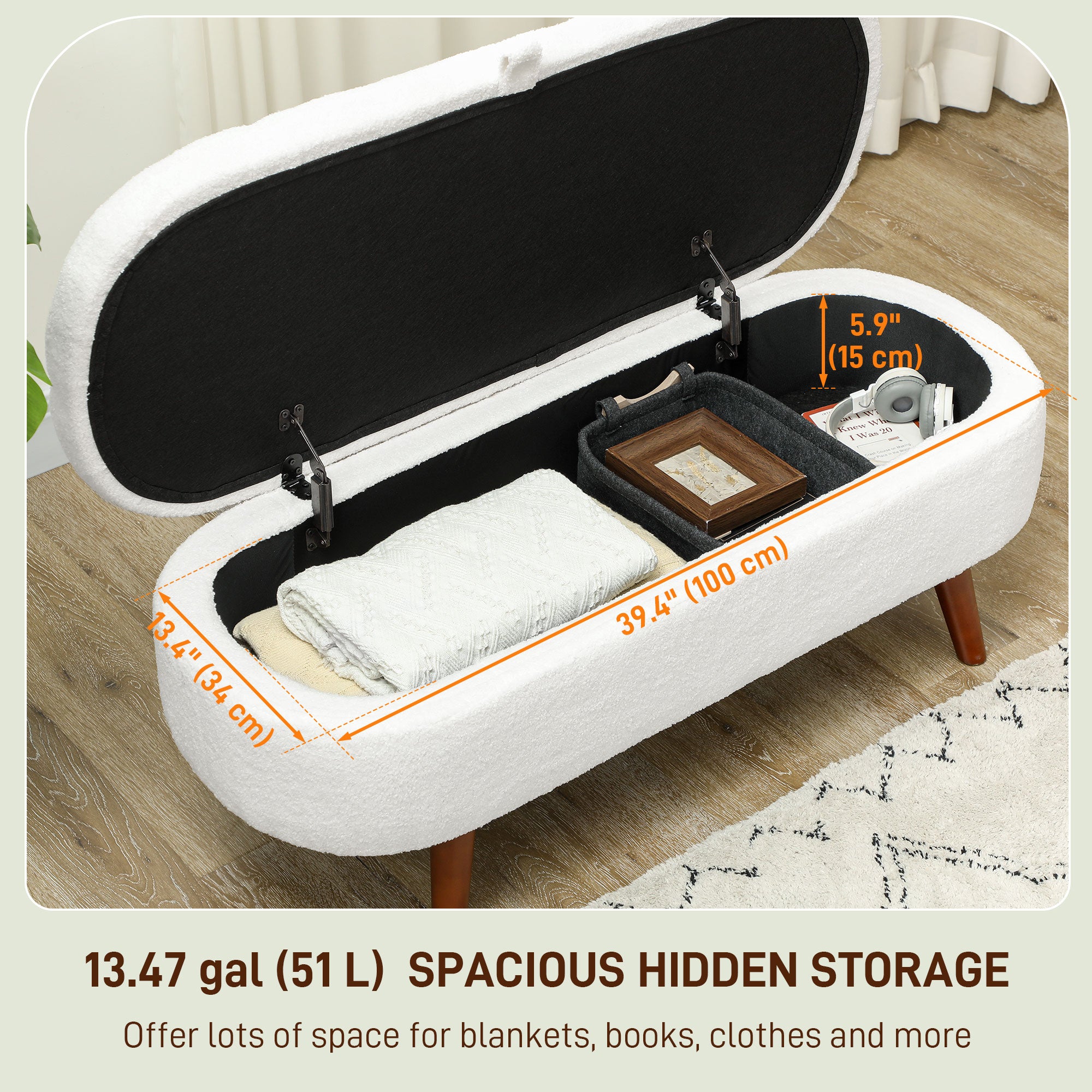 Discreet and functional storage: beneath its soft seat lies a spacious 51-liter chest, ideal for storing blankets, pillows, or everyday accessories. Its hinged lid opens smoothly, ensuring comfort and safety of use.