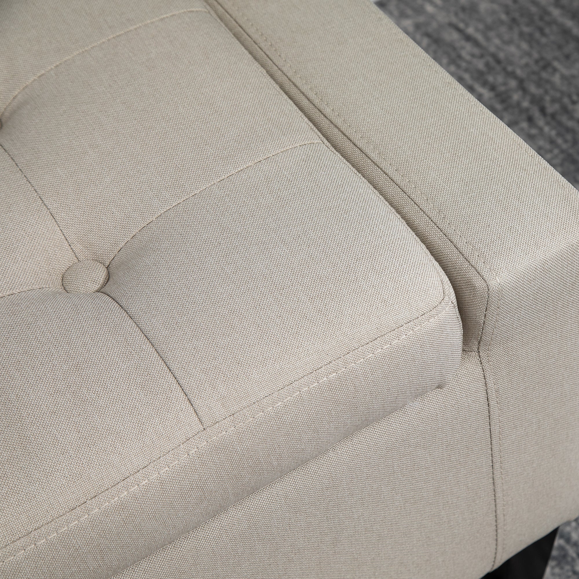 - Materials: Linen-look polyester fabric, rubberwood, high-density foam