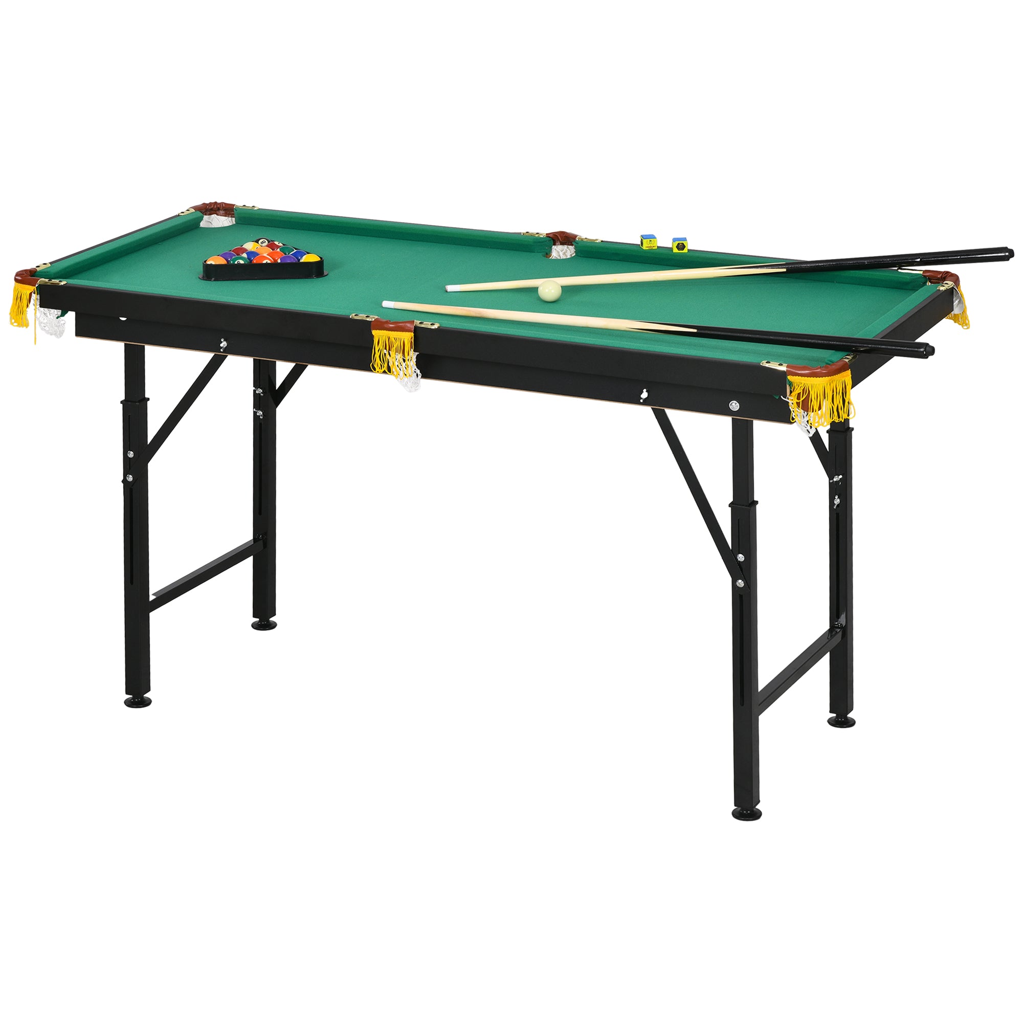 Comfort and design: Enhance your game room with this refined, classic-style pool table. Its green surface and fringed leatherette pockets give it an authentic, timeless look. Thanks to its adjustable and foldable design, it combines elegance and practicality, providing an enjoyable gaming experience for the whole family.