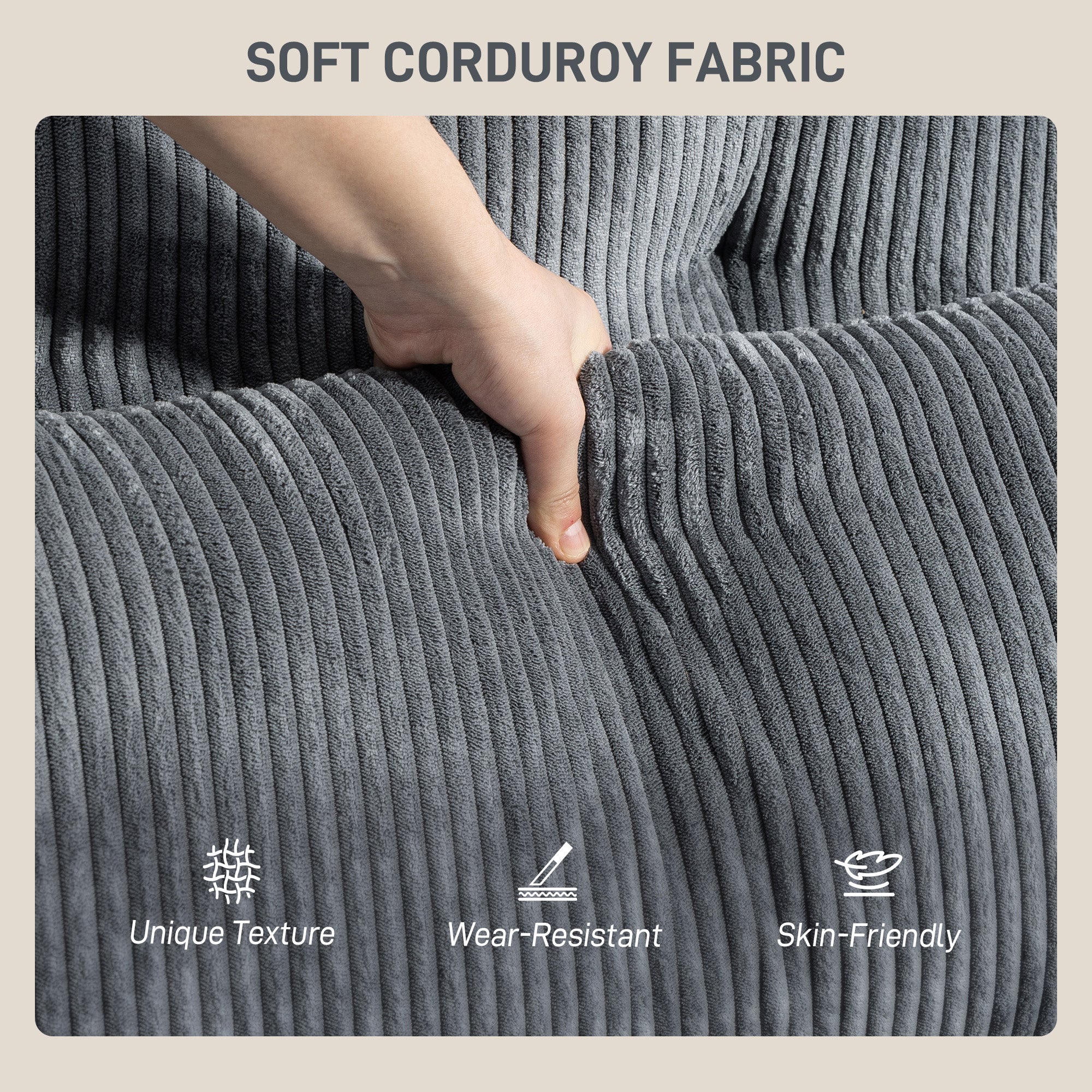 - Materials: Corduroy (100% polyester), foam, multi-layer panel, plastic