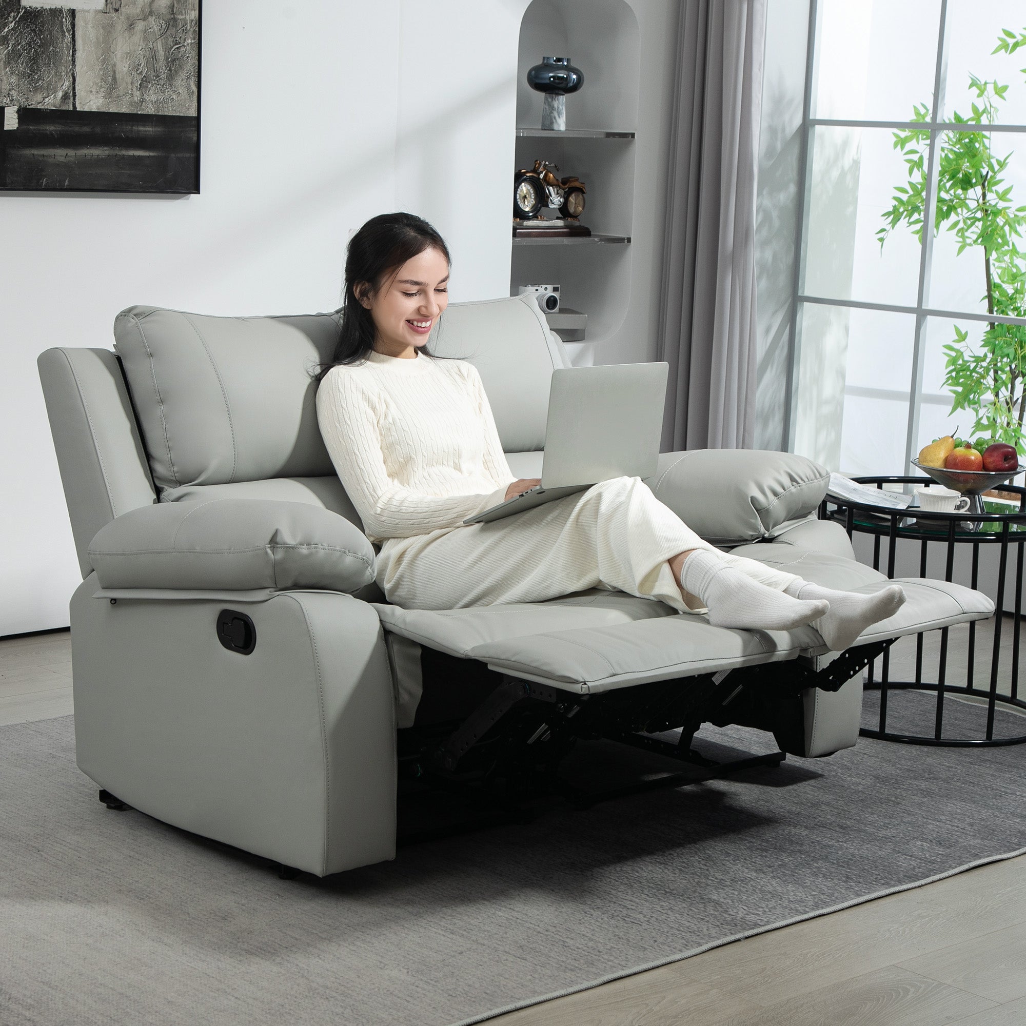 - Manual Recliner Sofa: Pull each side tab and control 2 recliners separately, with two fixed positions, from upright to 150° reclining with the footrest up, suitable for relaxing in the home office or watching movies in the living room.
