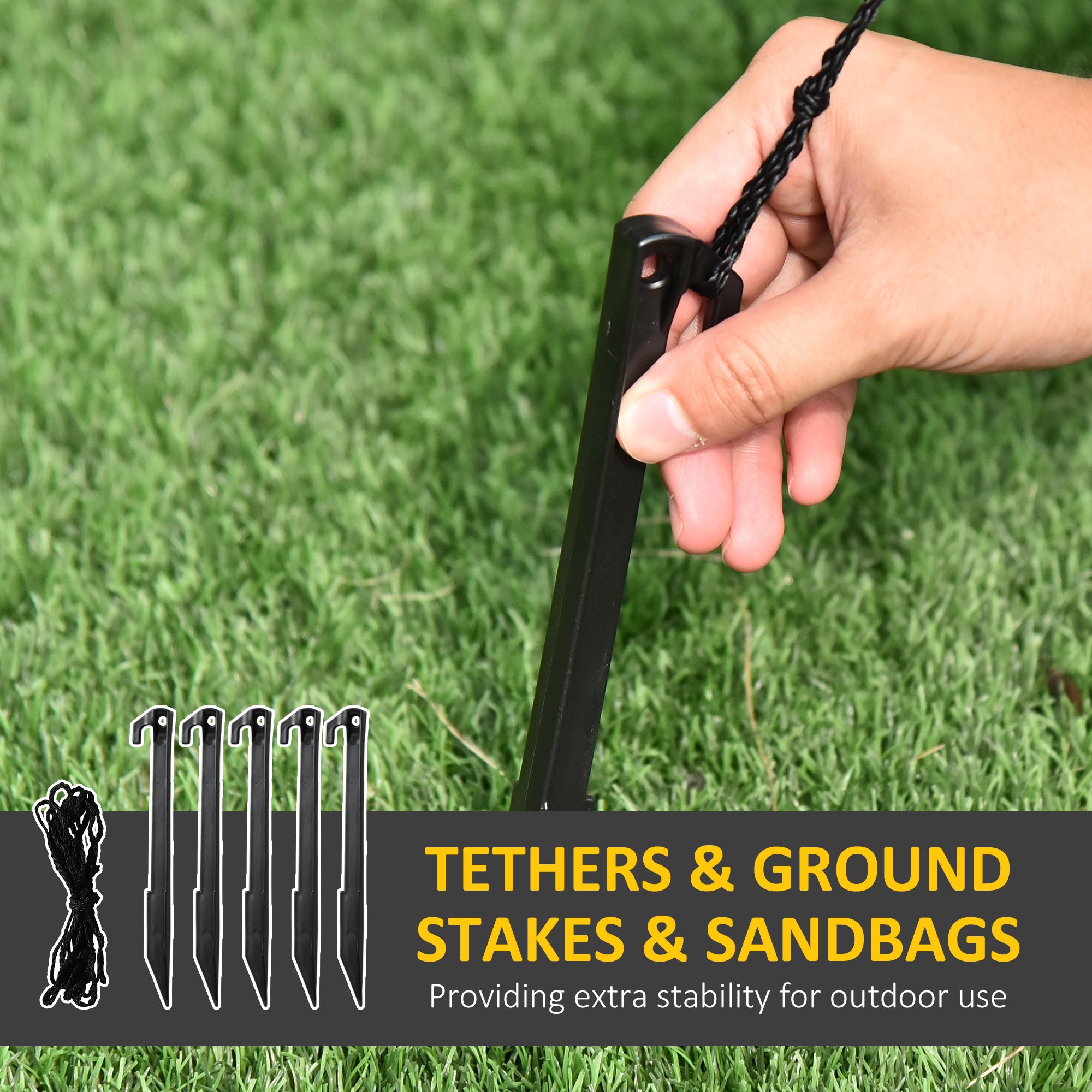 Durable and Stable: Made of sturdy, waterproof polyester, it comes with stakes, ropes, and sandbags to keep it securely in place outdoors.