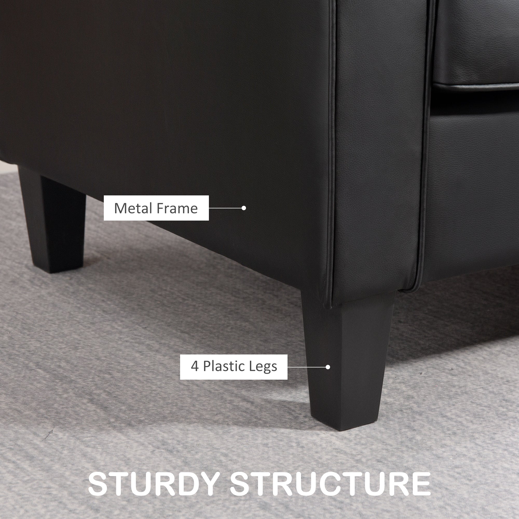 A modern and elegant design: This two-seater sofa combines a contemporary look with a timeless color. Its easy-to-clean black faux leather upholstery adds a chic touch and easily adapts to different decor styles.