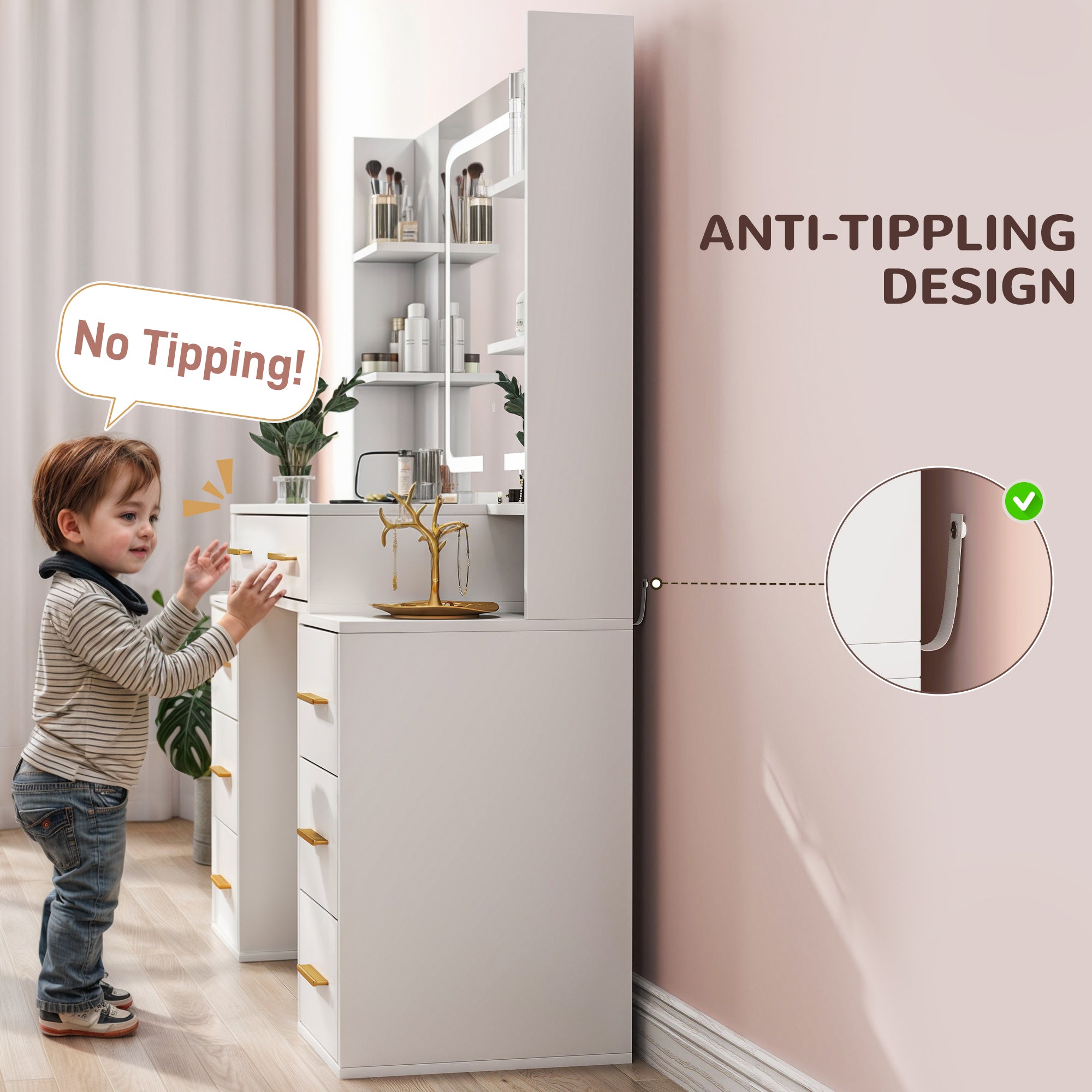 Modern design and enhanced safety: its sleek Nordic style, combined with its glossy white finish, blends perfectly into a contemporary bedroom or dressing room. Crafted from hard-wearing melamine-coated particleboard, this dressing table features an anti-tip device for optimal stability.