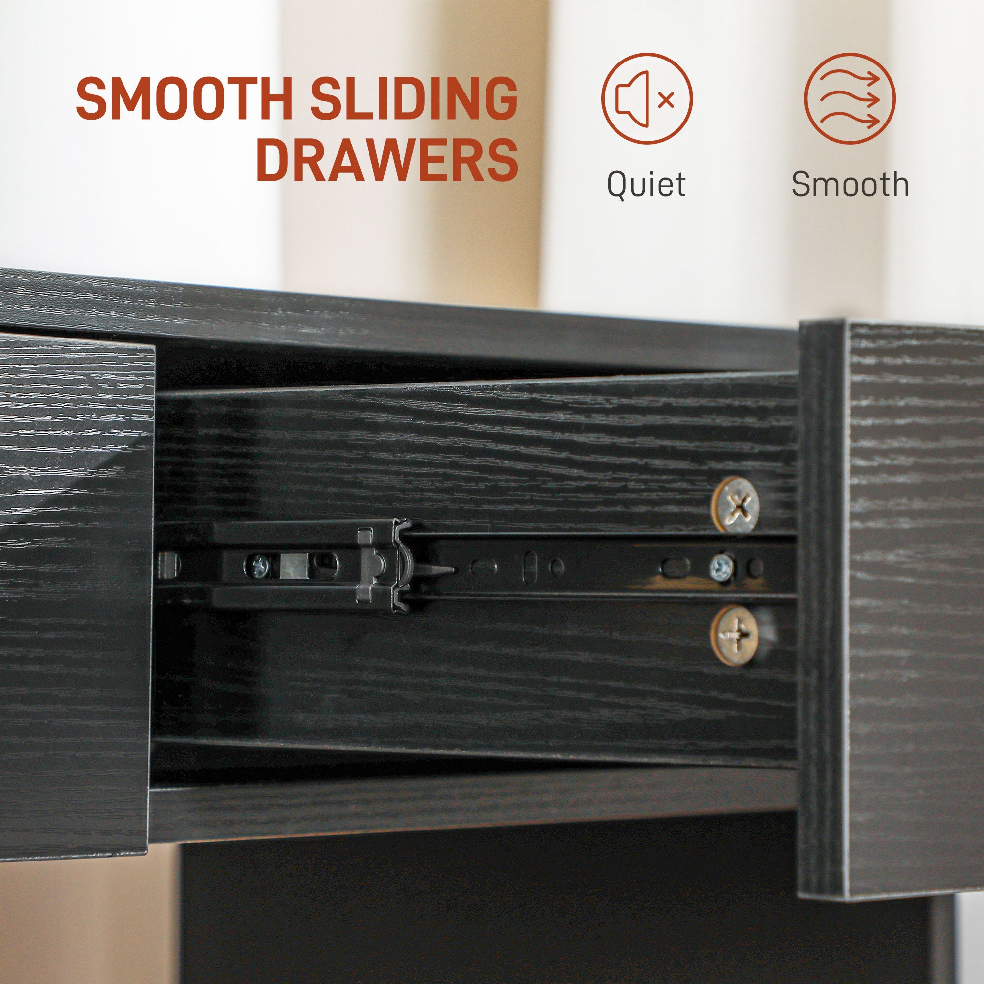 Optimized space and comfort: The dressing table offers a large top and two smooth-gliding drawers, perfect for organizing makeup, perfumes, accessories, and jewelry. The matching stool, padded and covered in PU leather, ensures lasting comfort even during long preparation sessions.