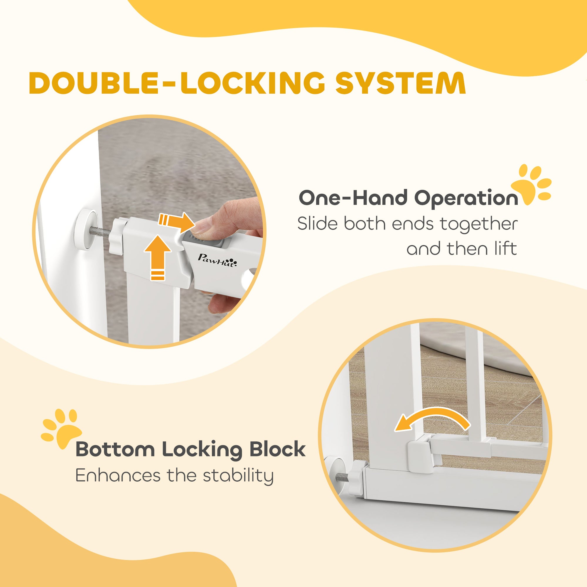 - Double Locking System: An adult can open the gate with one hand by sliding the button on the top (slide both ends simultaneously, then lift). The dog gate has a lower locking block for better stability and pet safety.
