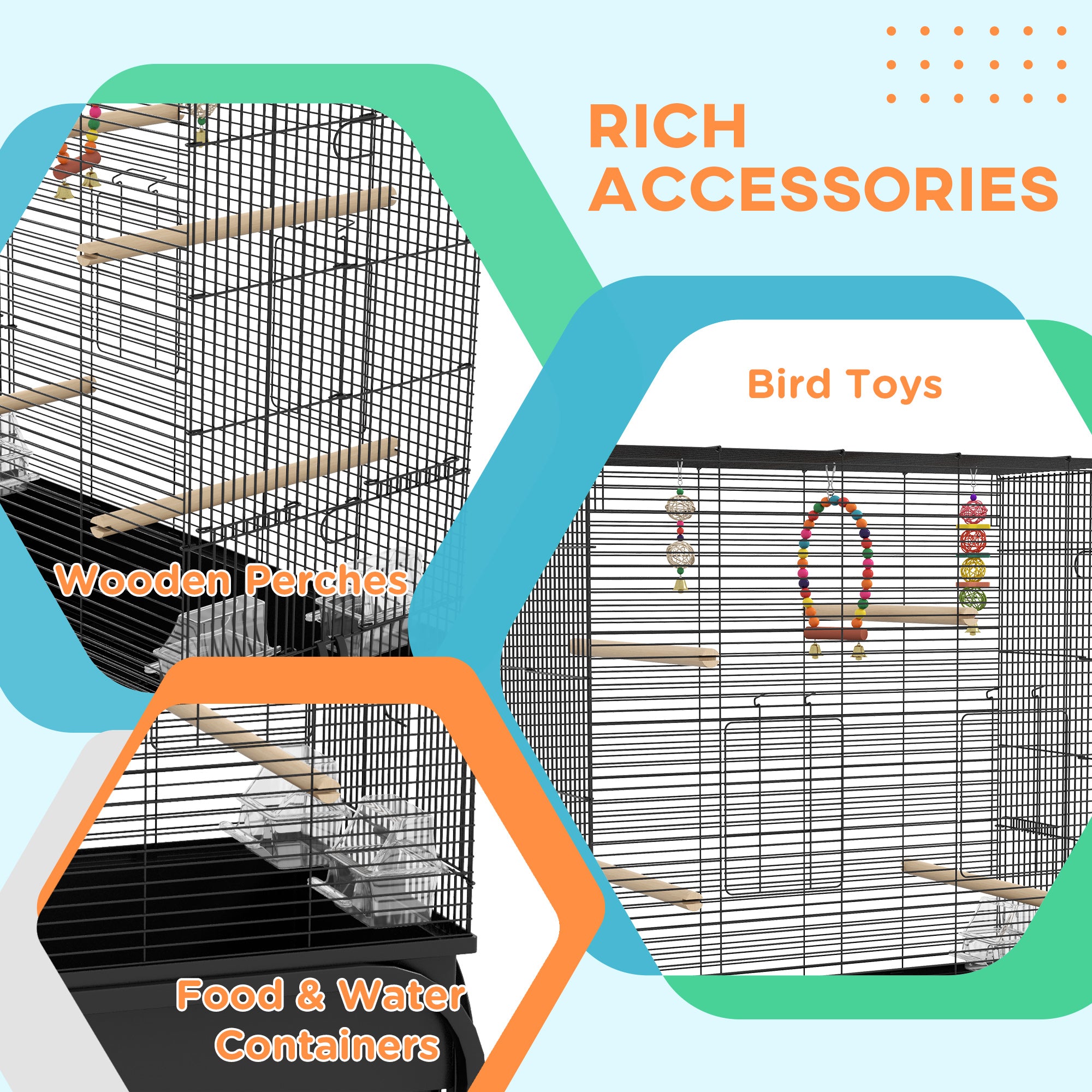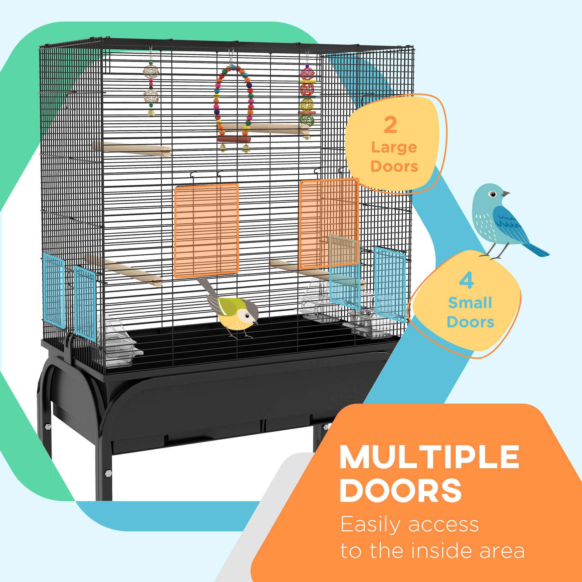 Complete Equipment: The cage includes four wooden perches, four plastic feeders, and three toys to entertain your birds. The lower shelf is ideal for storing food or accessories.