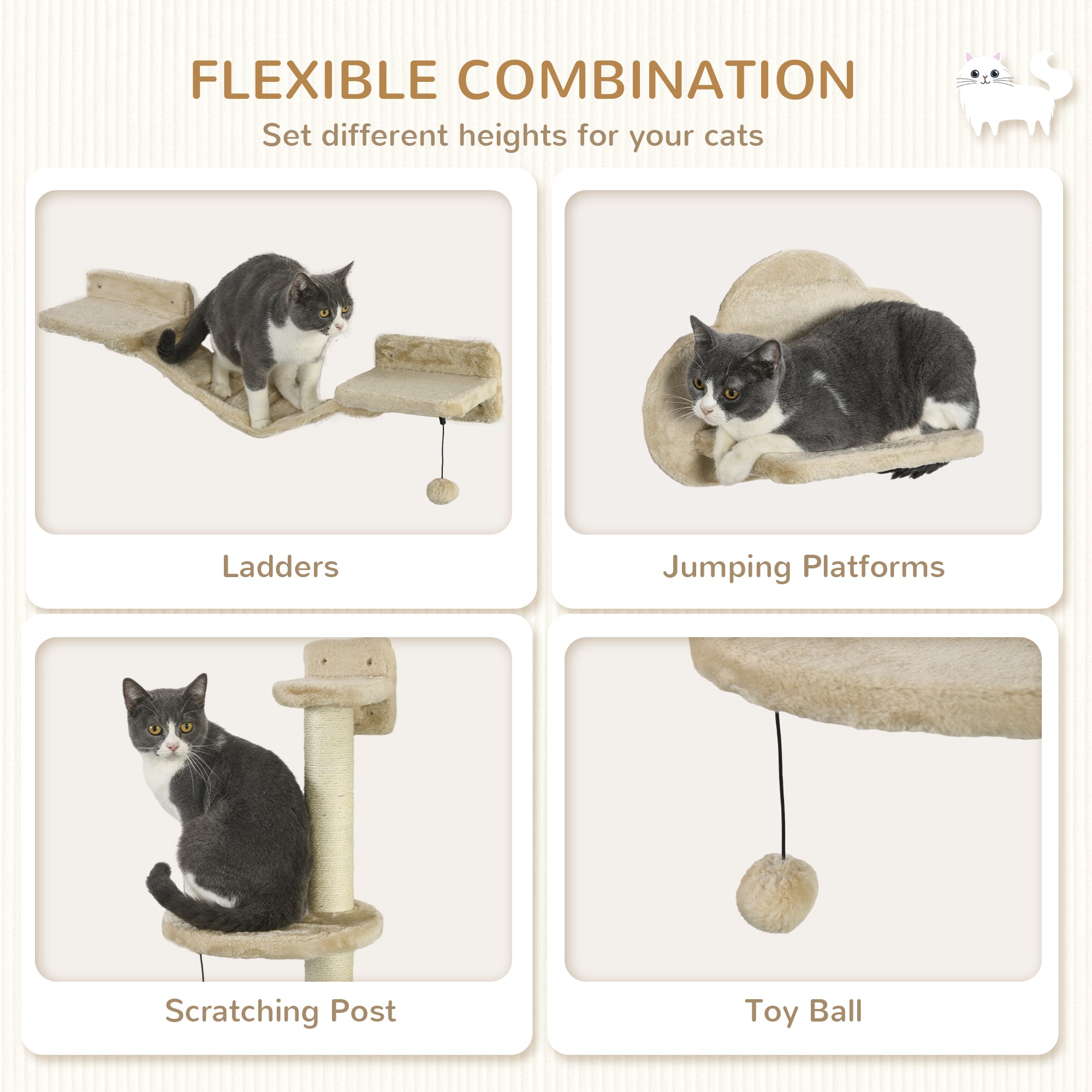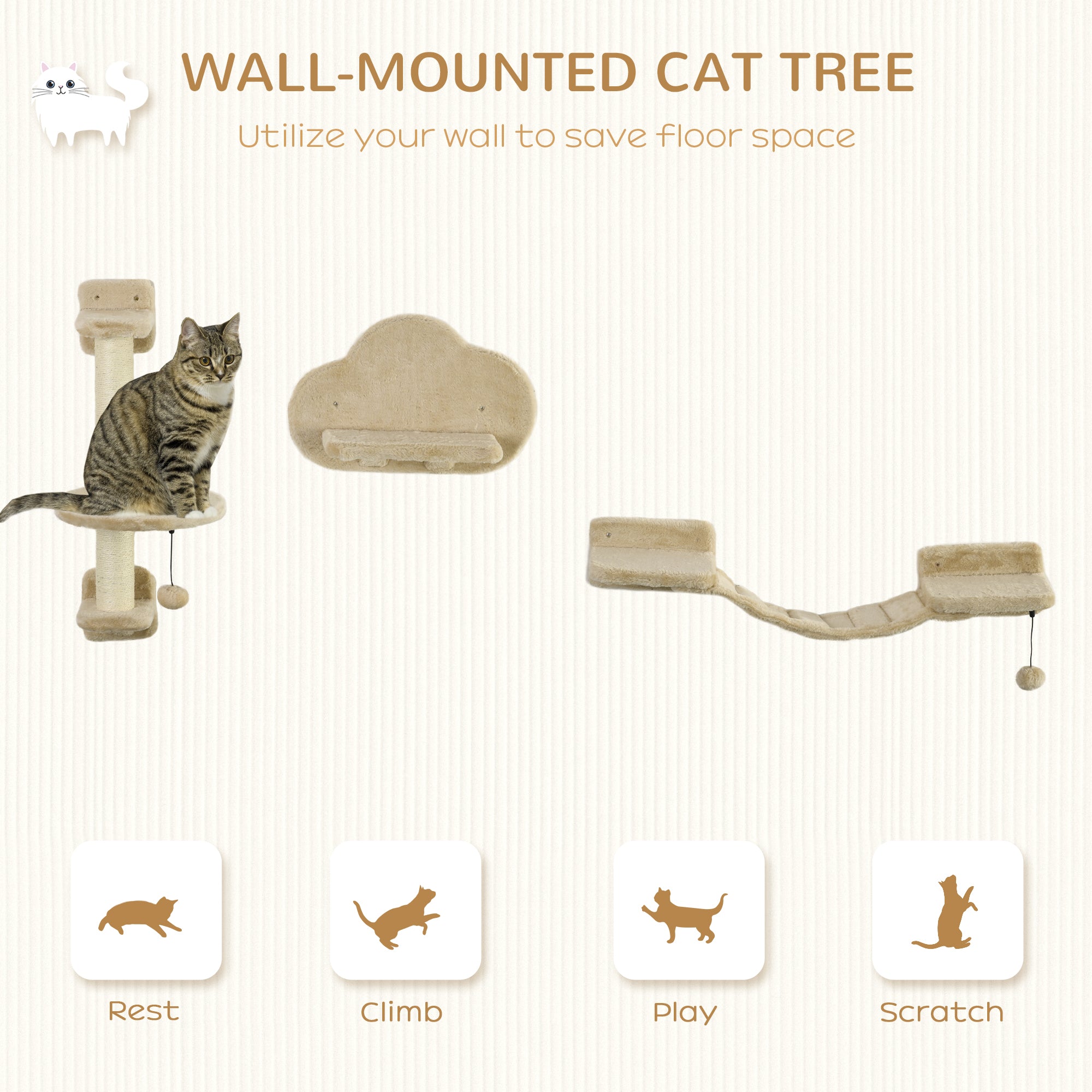 Wall-mounted cat tree – Beige wall-mounted play area with perches and scratching posts