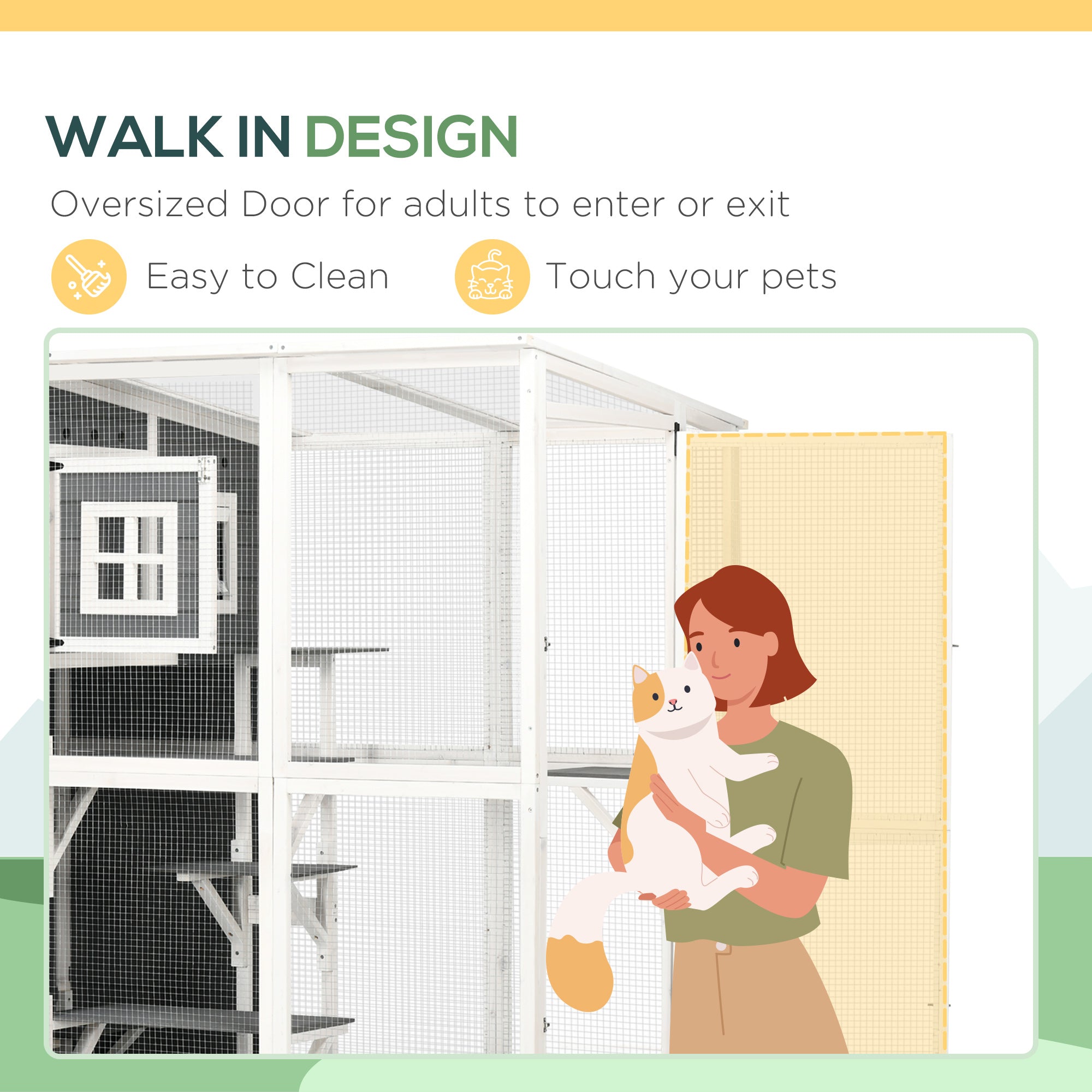 Outdoor cat house – White and grey wooden structure with PVC roof and multiple platforms