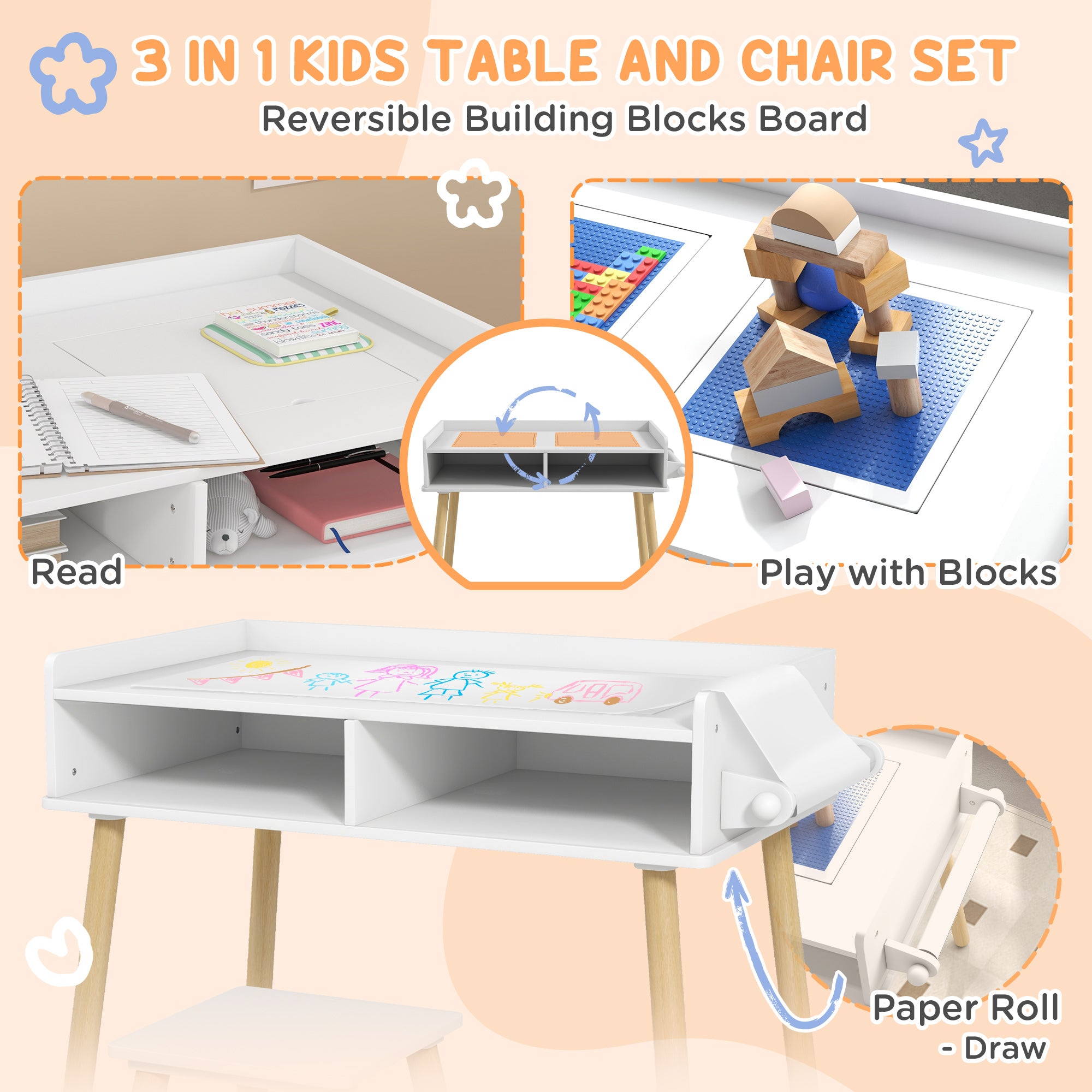Functional and ingenious design: Featuring a built-in paper roll, the table encourages unlimited artistic activities. Its two storage compartments keep pads, pencils, and papers well organized, for a space that's always clean and ready to use.