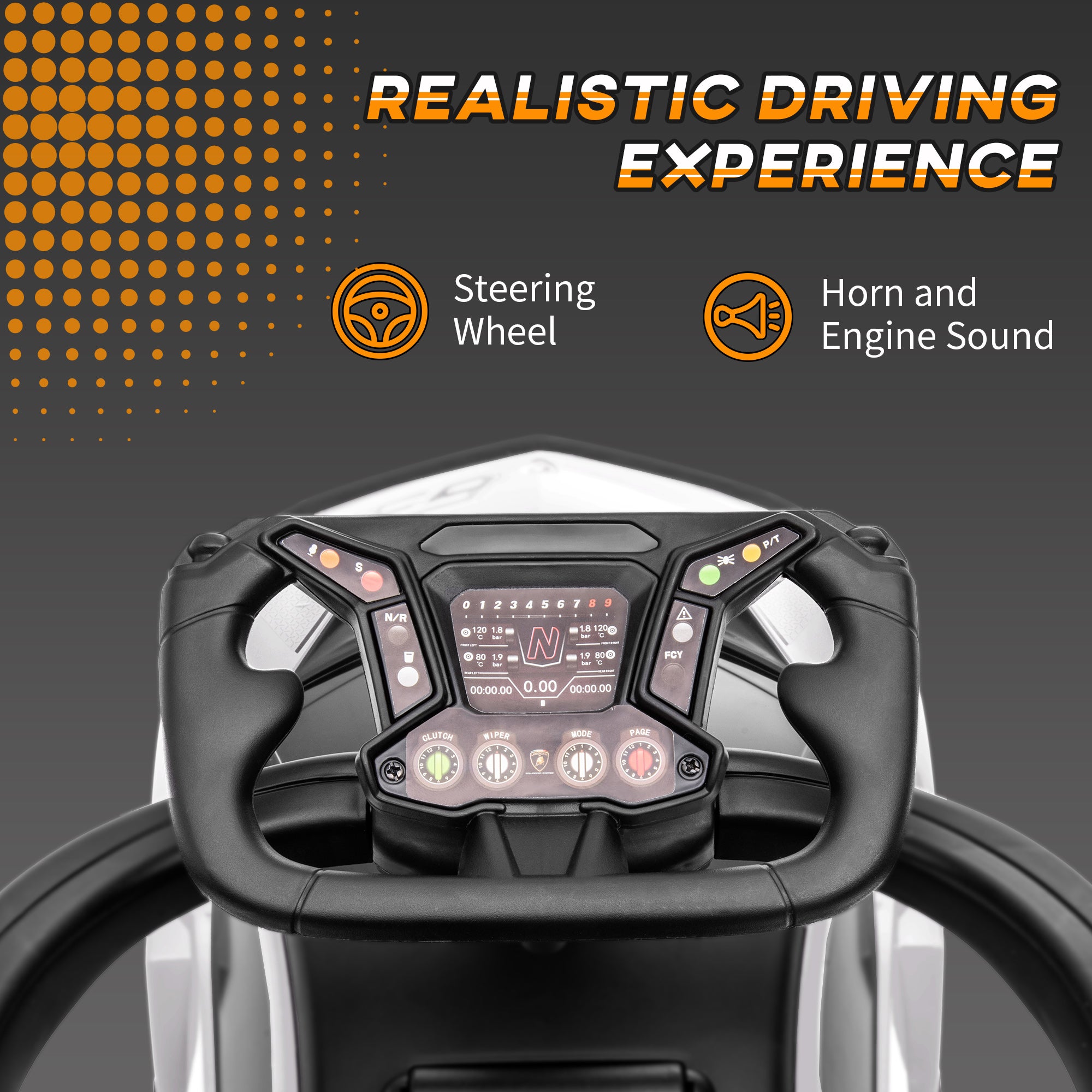 - Steering wheel with horn and engine sound (2 AA batteries not included)