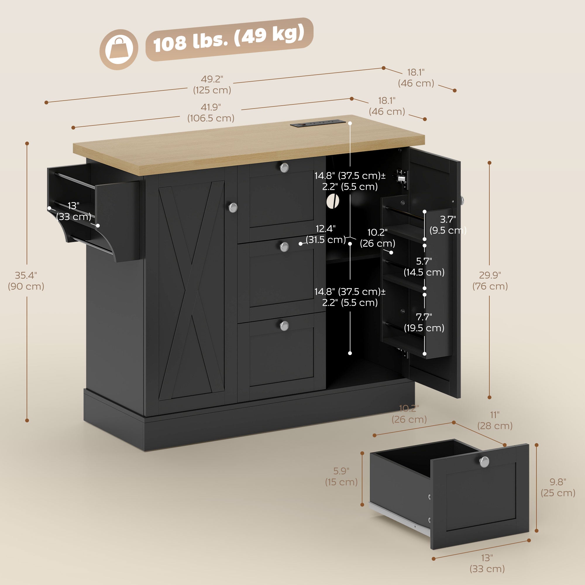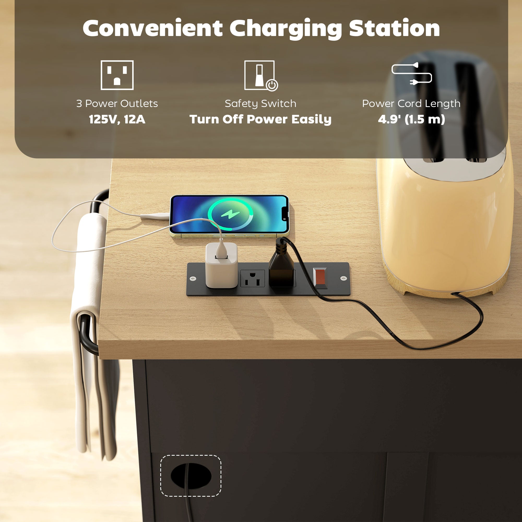 Farmhouse-style mobile kitchen island with integrated power outlets and storage