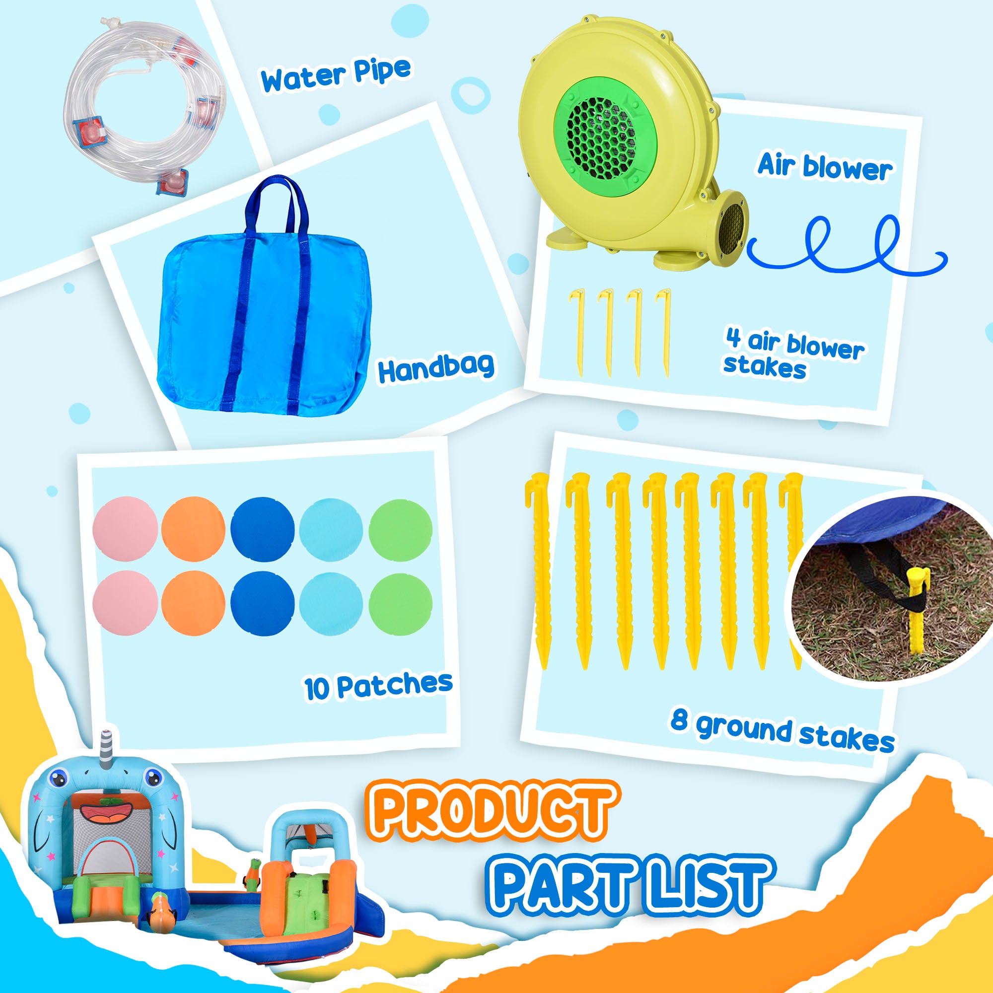 - Contains: 1 bouncy castle, 1 blower, 1 water hose, 1 carrying bag, 12 ground stakes, 1 manual, repair patches