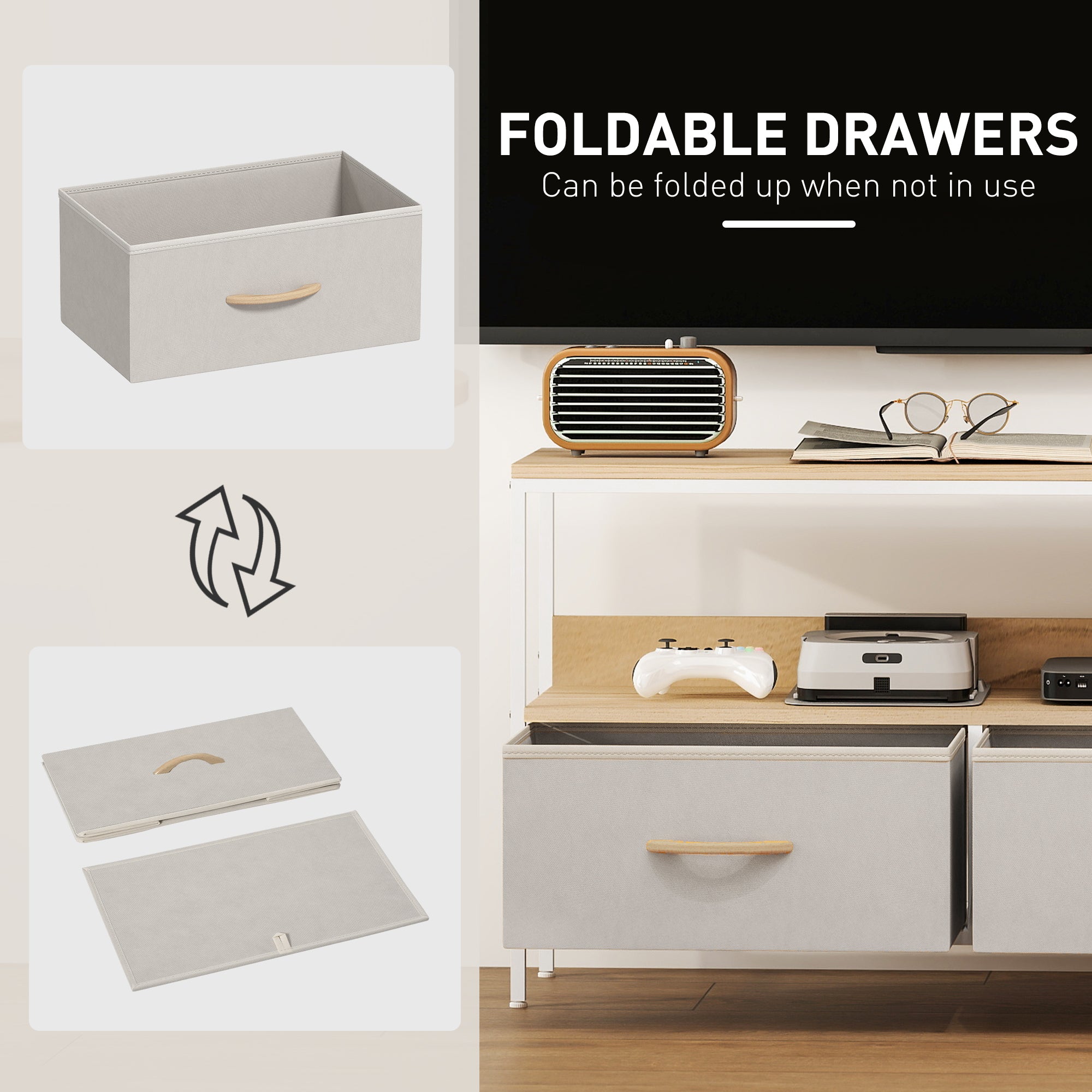 Smart storage: The tabletop can accommodate a TV up to 47 inches, while the central open shelf is ideal for your consoles, players, or remotes. The two foldable drawers add clever, discreet storage space for your media accessories.
