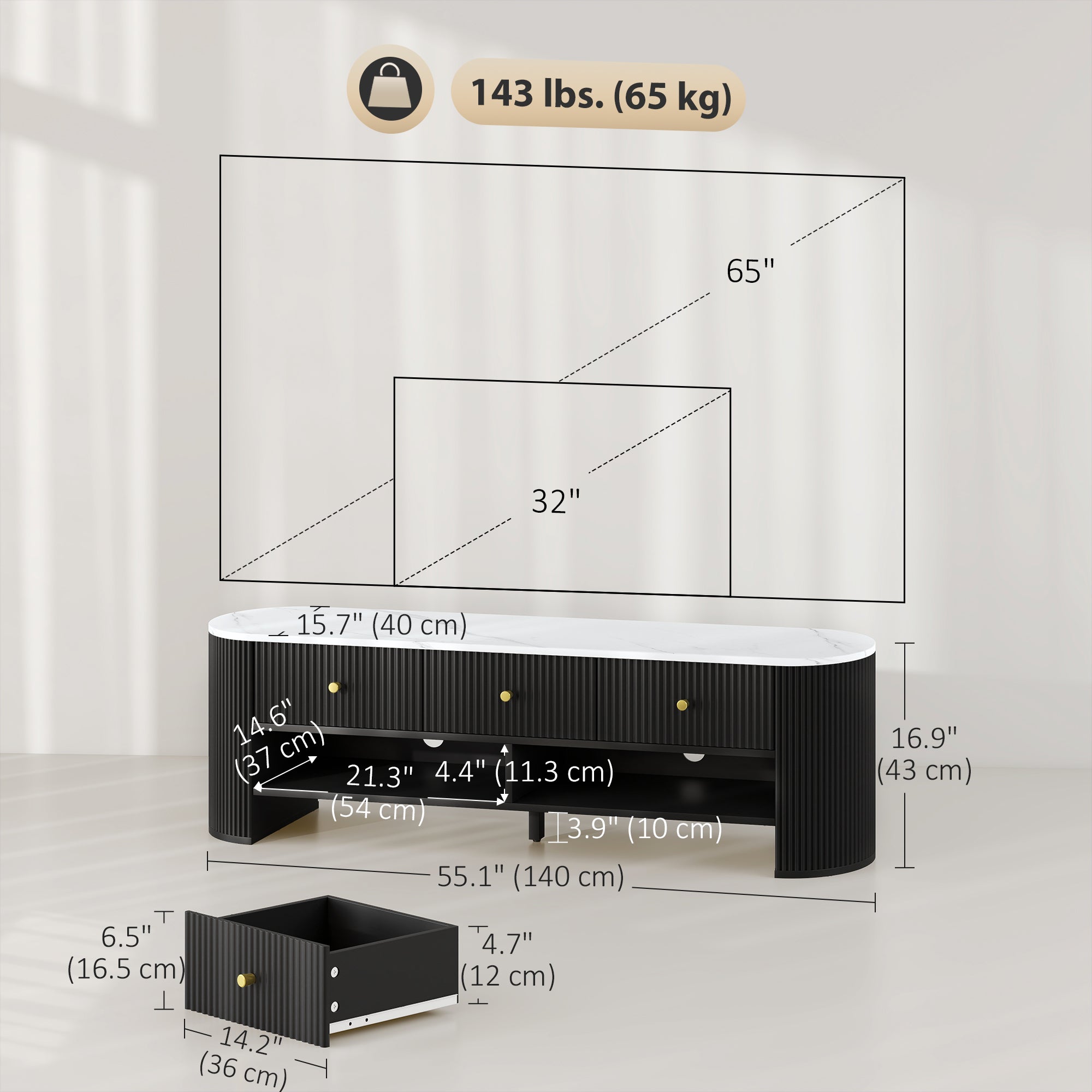 - Overall dimensions: 55.1" L x 15.7" W x 16.9" H (140 x 40 x 43 cm)