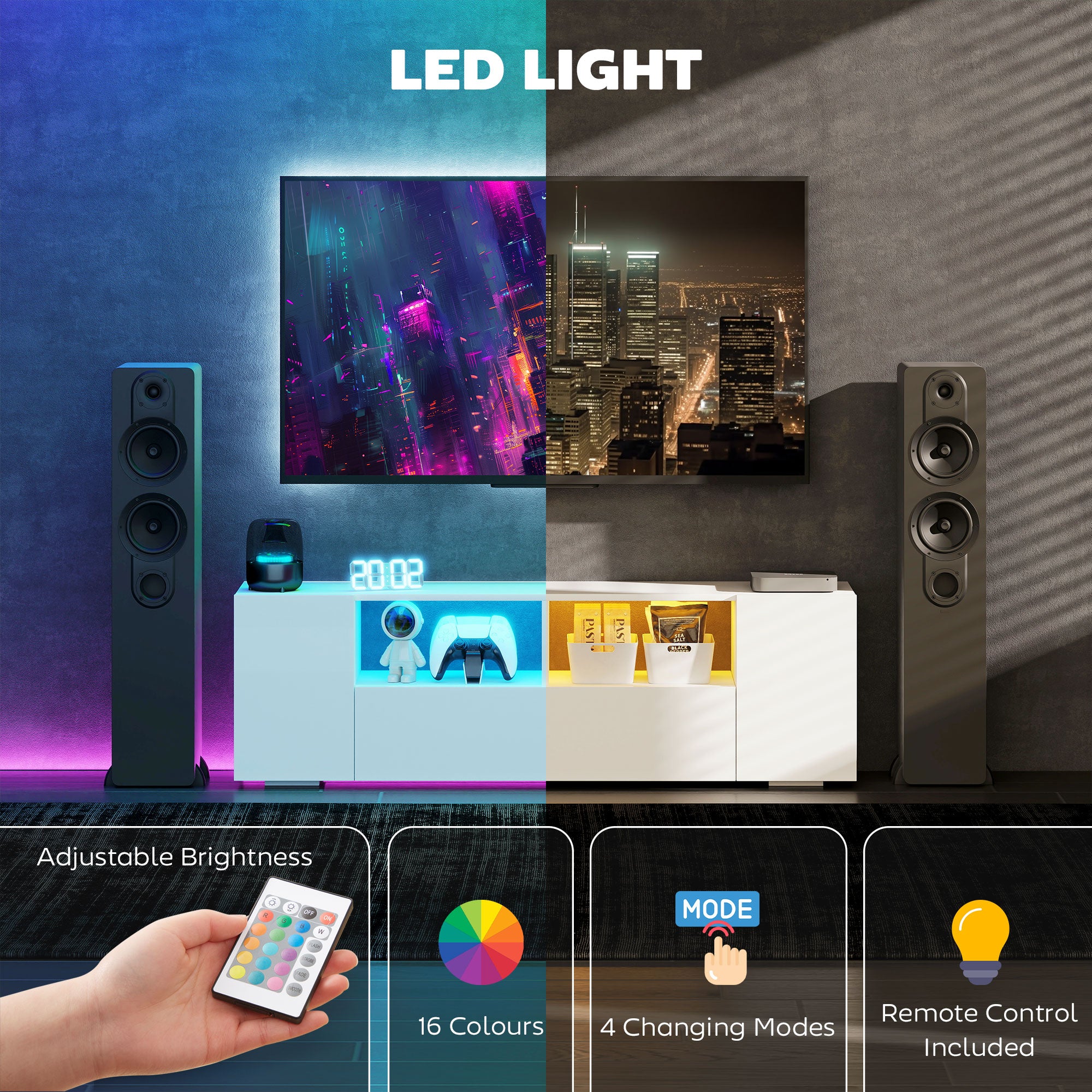 Customizable lighting atmosphere: Equipped with LED strips with 16 colors and 4 flashing modes, this furniture creates a unique atmosphere. The brightness is adjustable via remote control to adapt to any atmosphere, from home theater to friendly evenings.
