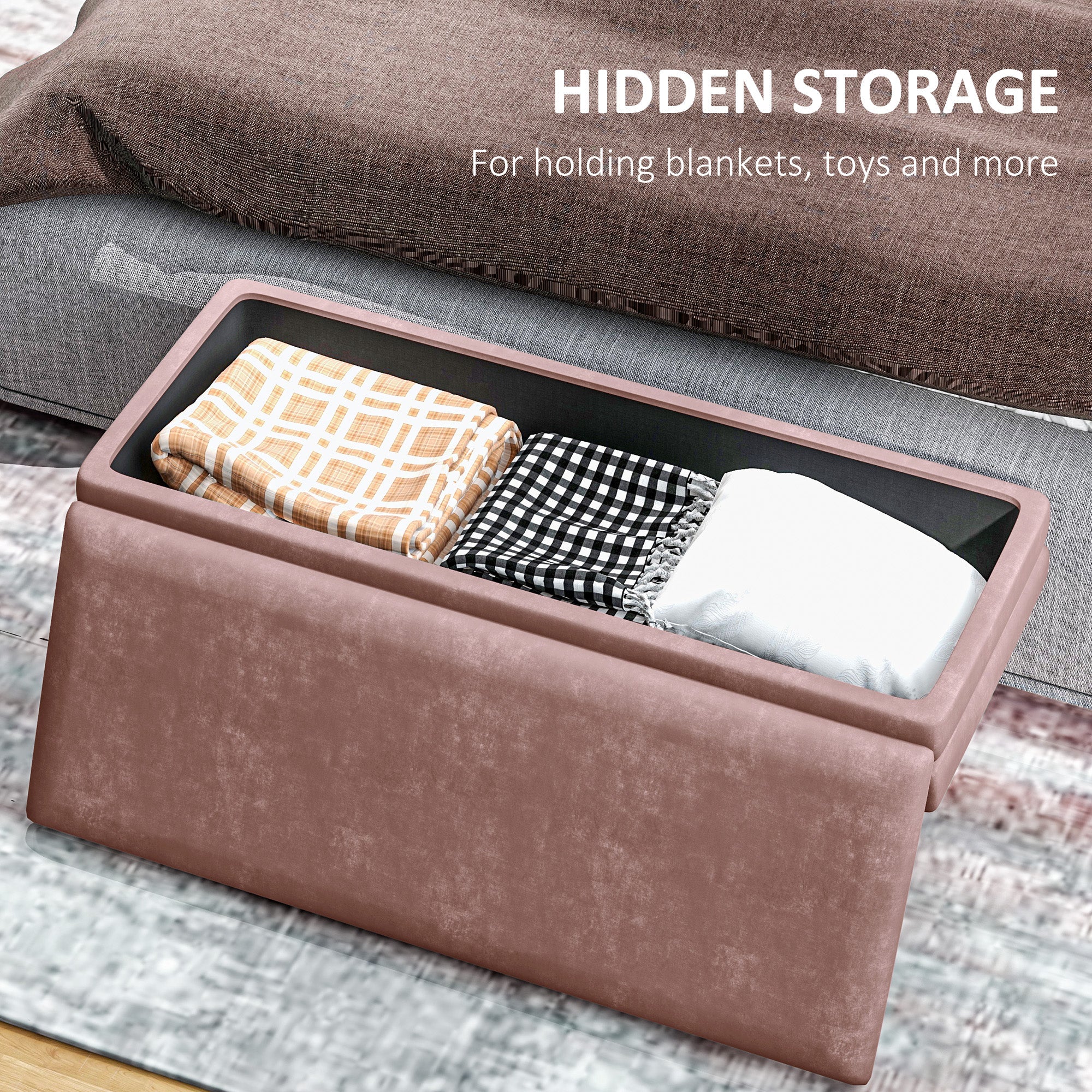 Elegance and softness: This pink velvet ottoman bench adds a feminine and refined touch to your home. Its soft fabric and plush seat bring comfort and style, whether in the bedroom, living room, or entryway.
