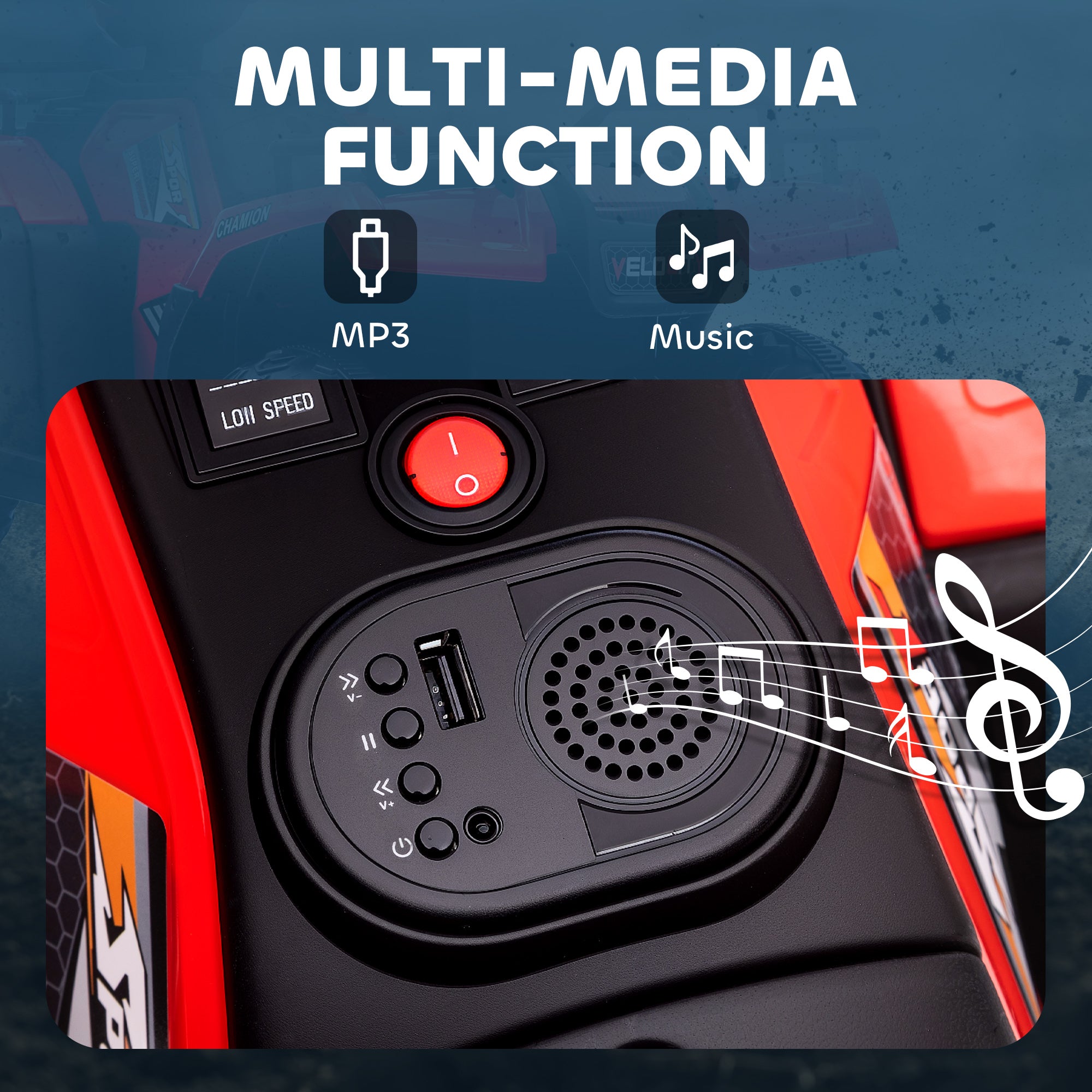 Musical fun and total immersion: Thanks to its MP3 and USB port, your child can listen to their favorite songs while driving. This feature turns every ride into an interactive and joyful adventure, whether in the garden or on the neighborhood sidewalks.