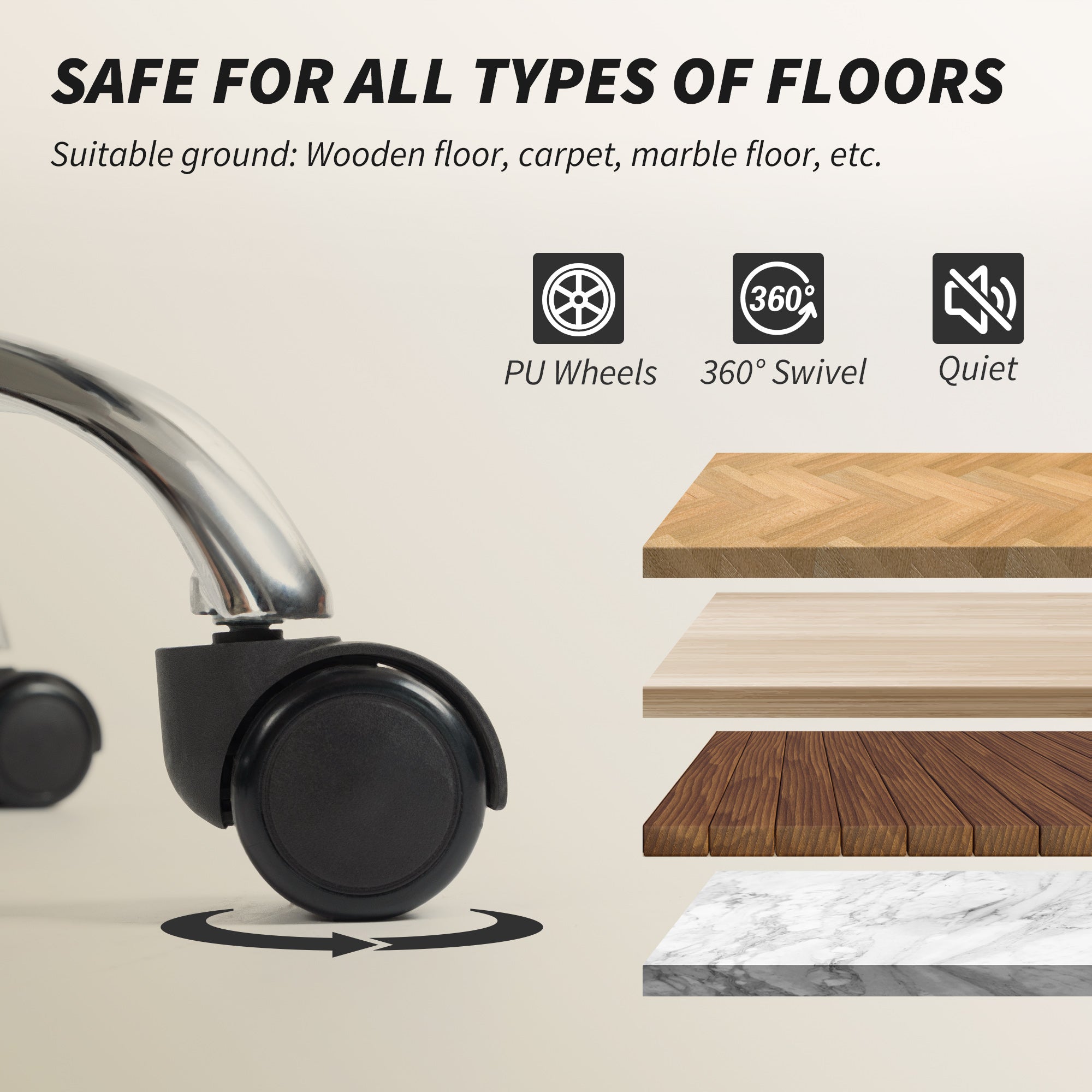 Assembly is required and is easily done using the included manual. The PU casters glide quietly while protecting your floors, and the smooth surface can be easily cleaned with a damp cloth.