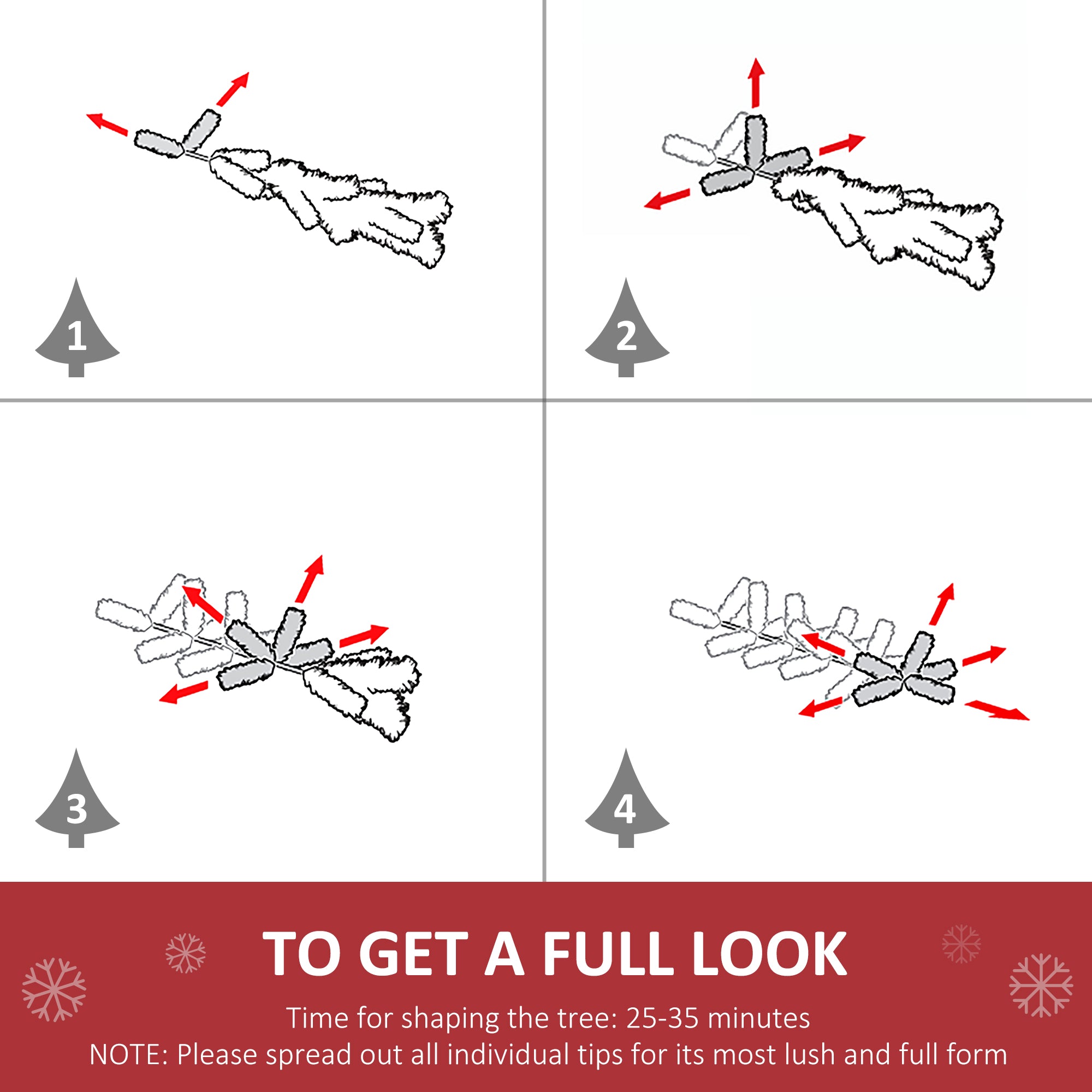 - Note: For best results, carefully unfold all branches. Recommended shaping time: 25 to 35 minutes.