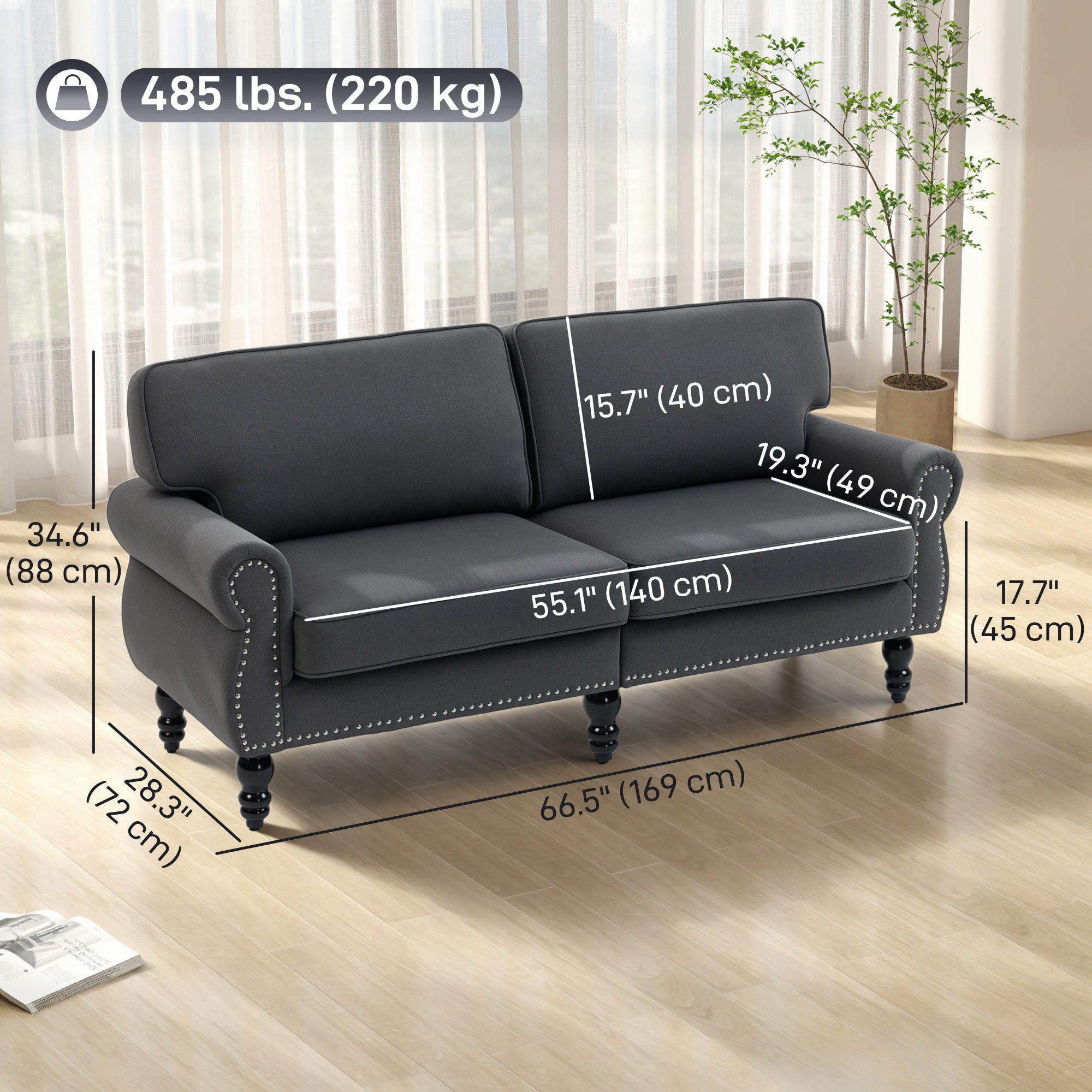 Comfort and design: This traditionally styled loveseat adds an elegant touch to your interior with its decorative nailhead trim, turned legs, and rolled armrests. Its linen-look upholstery offers a warm and timeless appearance that blends easily with various decorating styles.