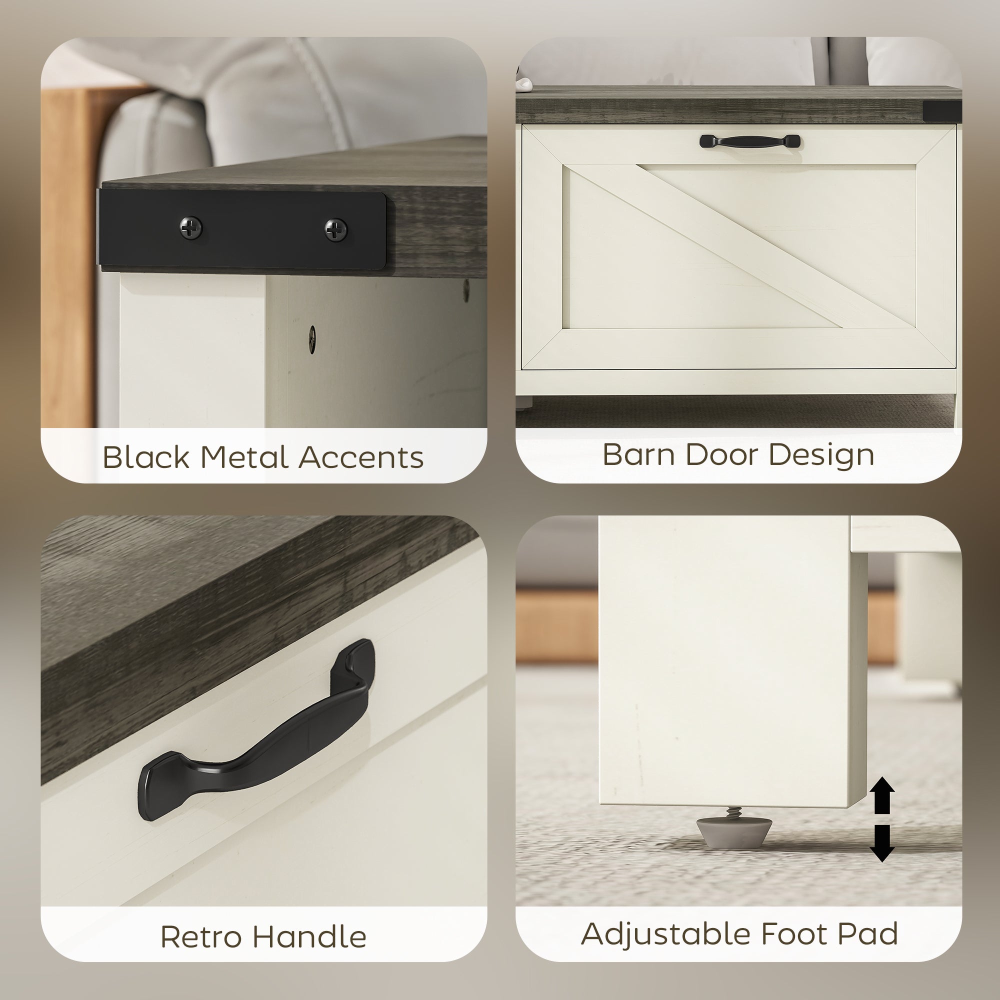 Rustic and modern charm: This coffee table combines rustic design with contemporary elements to create a unique and elegant piece. Its barn door inspiration, retro fronts, and semi-open lines make it a piece of furniture with strong visual character.