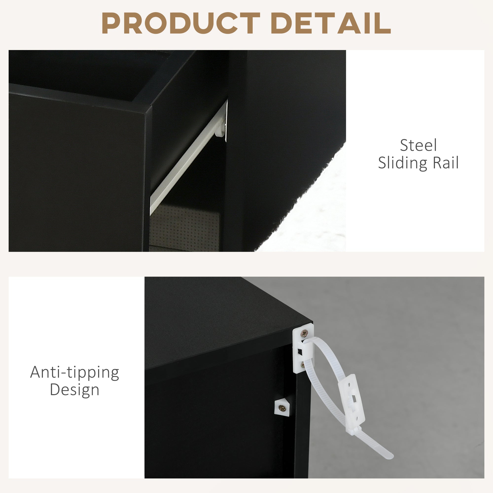 Reliability and safety: Designed in solid particle board with steel rails, non-slip pads and anti-tip system, it guarantees stability and longevity.