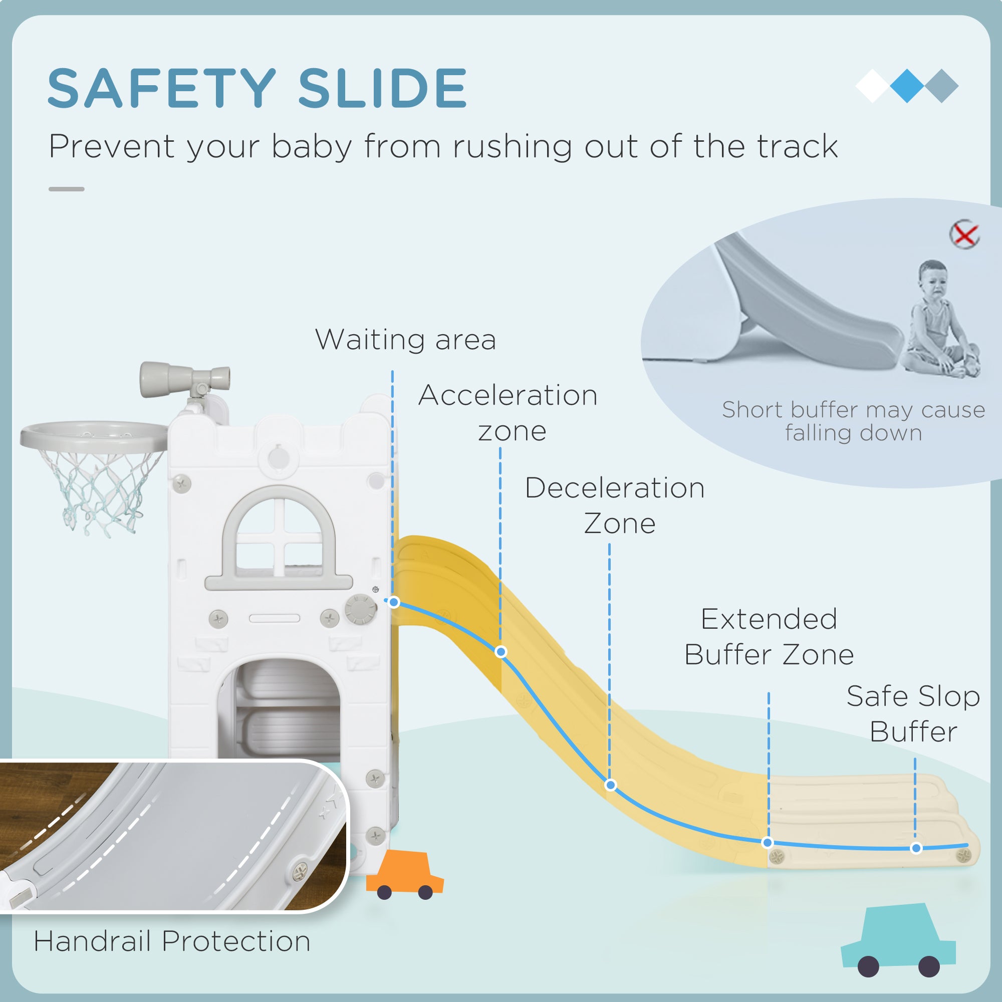 Safe Slide: Designed with an acceleration zone, a deceleration zone and a final buffer, it ensures smooth and safe descents for toddlers.