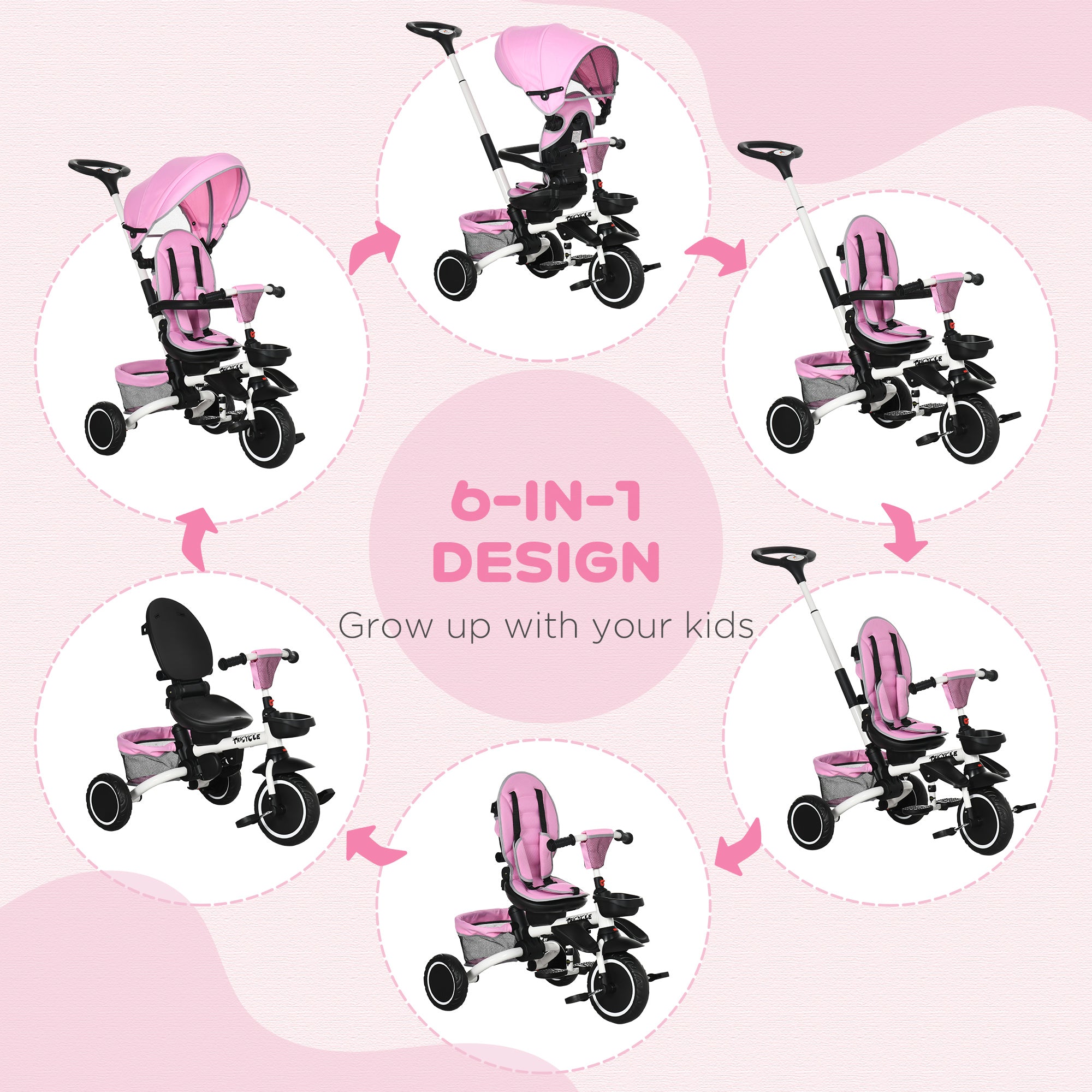 Pink and white 6-in-1 children's tricycle with adjustable canopy and parent handle