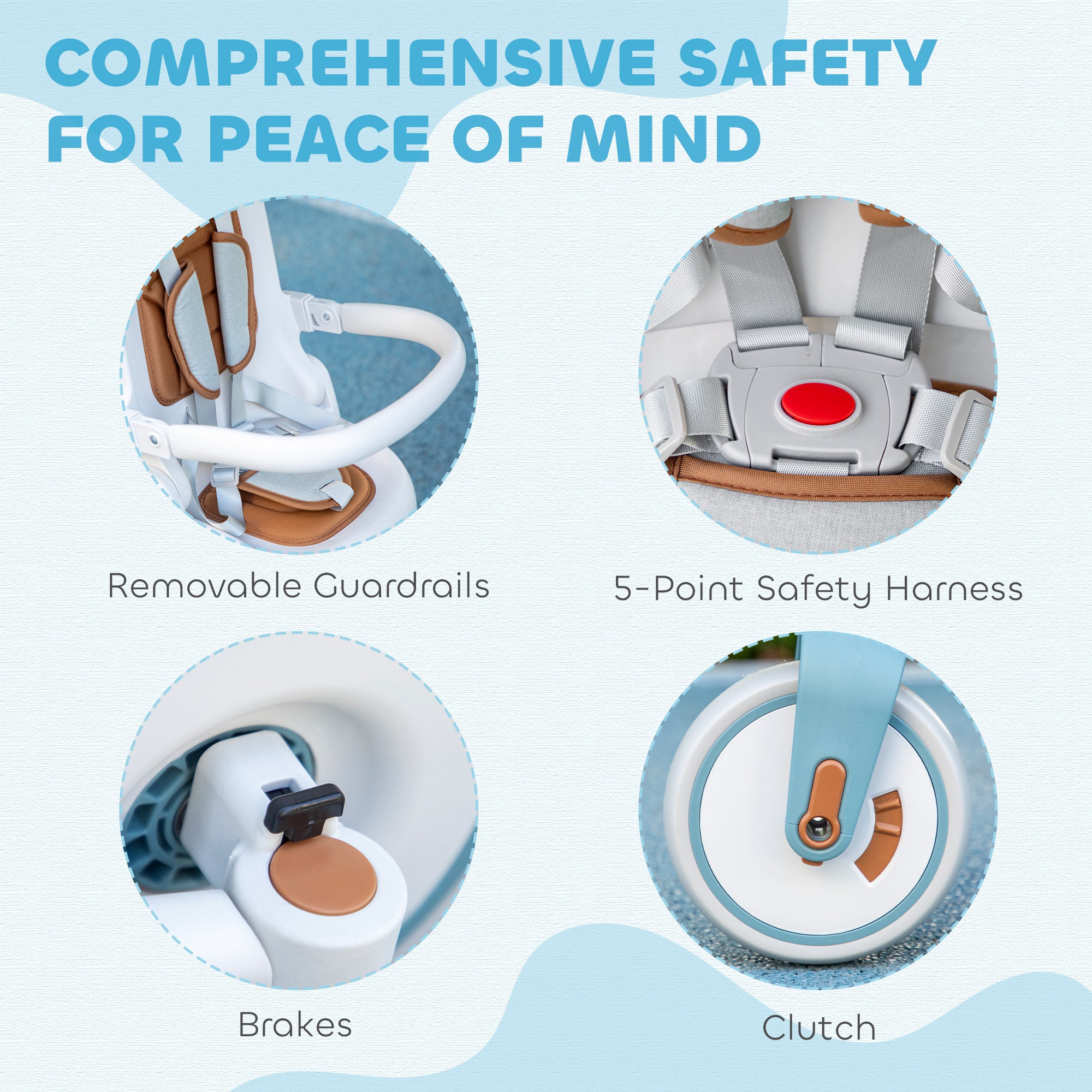 Quality Materials: Made of aluminum alloy and PP plastic, it combines lightness and strength. The sturdy wheels provide a stable ride on different types of surfaces. The 5-point safety harness and removable bar ensure safety, and the durable materials ensure prolonged use.